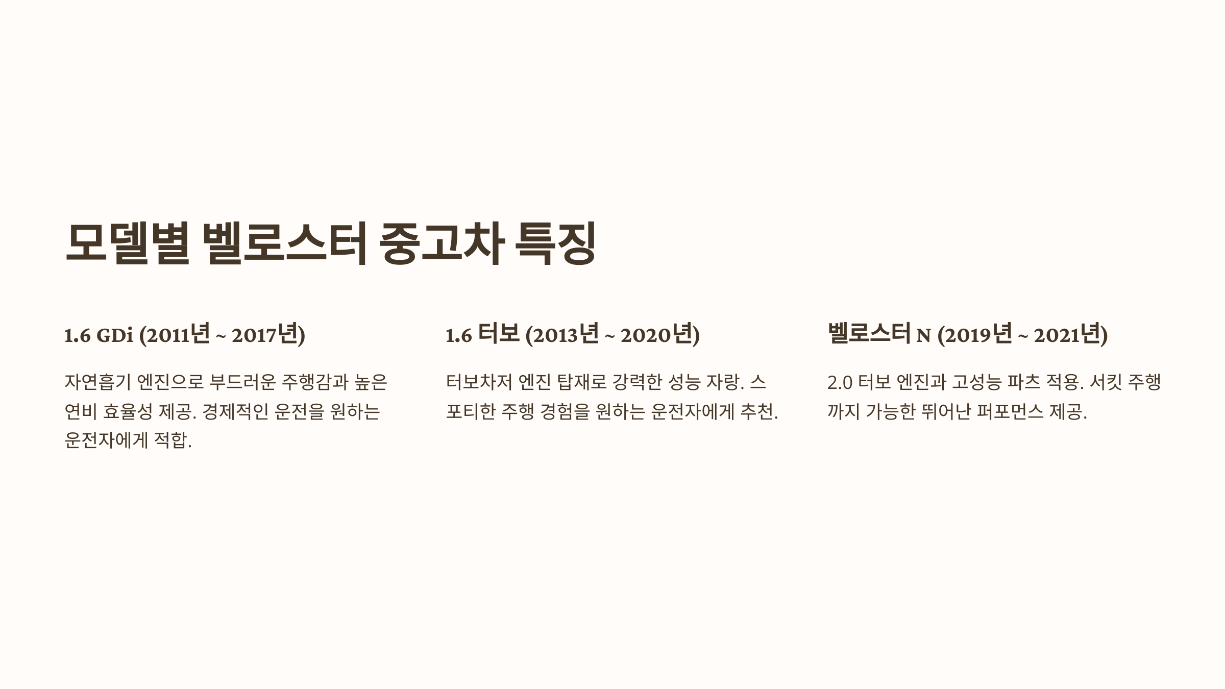 - 단점: 터보 모델 대비 부족한 출력, 연식이 오래된 모델은 부품 노후화 가능성