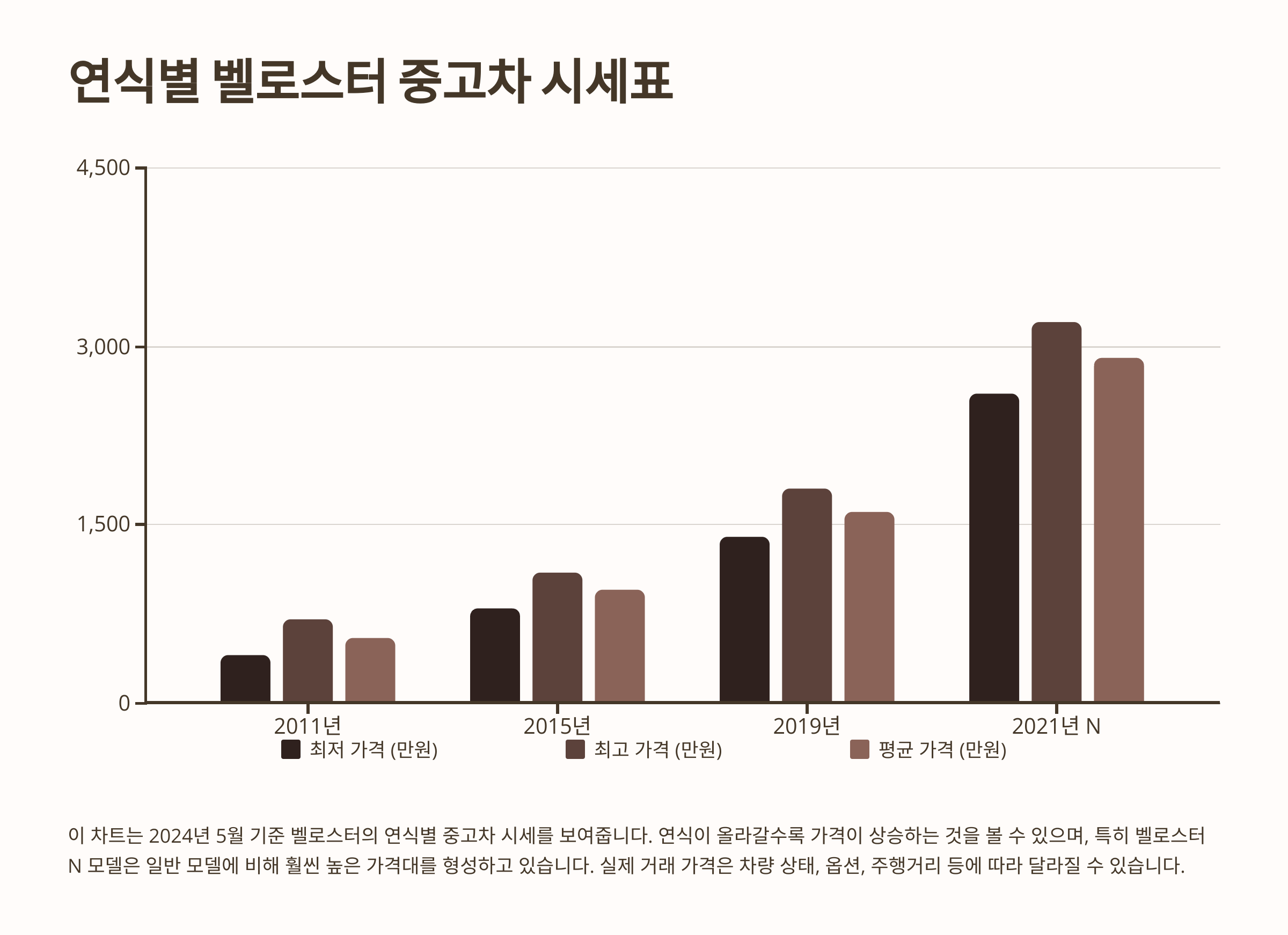다음은 실제 중고차 매물 데이터를 기반으로 작성된 벨로스터 연식별 중고차 시세표입니다.