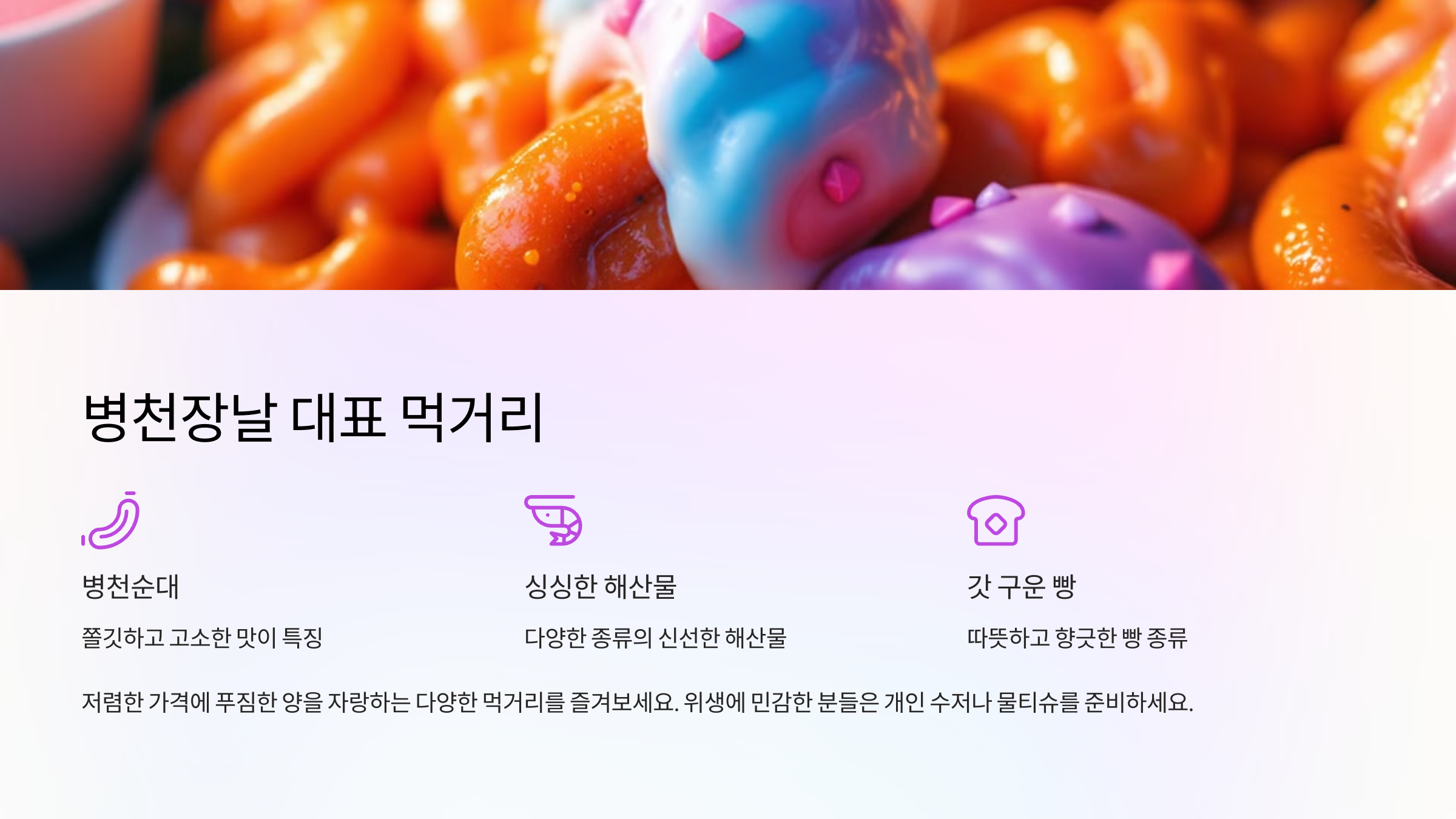이 글에서는 병천장날을 방문하기 전 알아두면 유용한 정보들을 꼼꼼하게 정리했습니다. 병천5일장 일정부터 주차 정보, 먹거리, 볼거리, 그리고 장날에 대한 궁금증까지, 병천오일장 방문을 위한 모든 것을 알려드립니다. 지금부터 함께 병천장날의 매력에 푹 빠져볼까요?