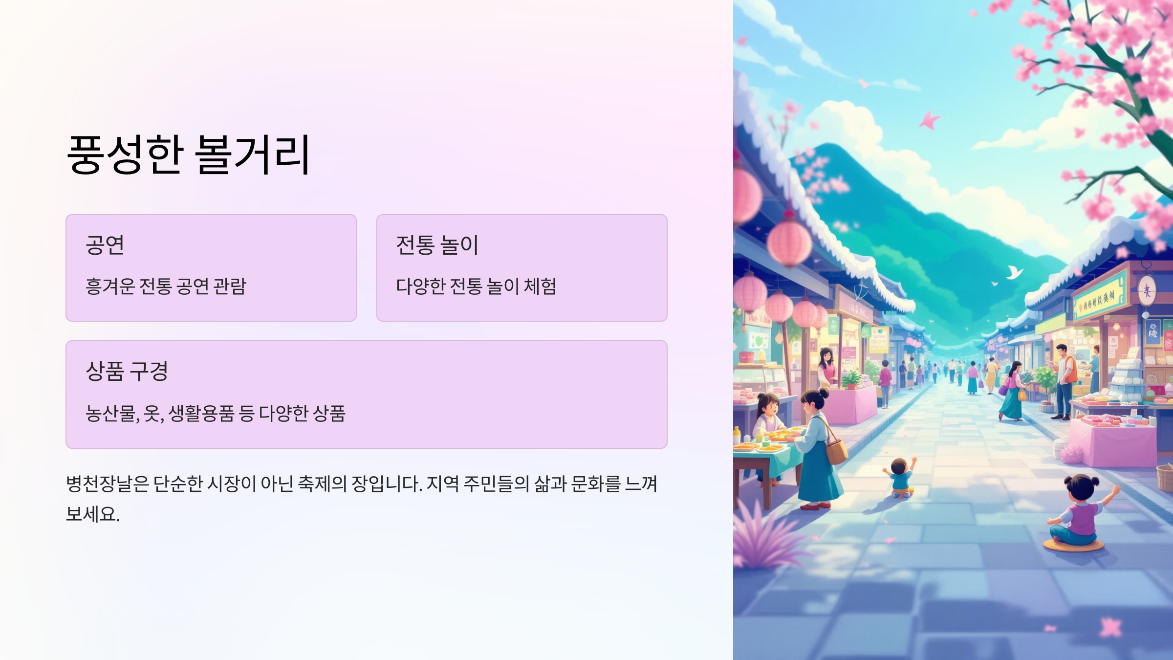 병천장날은 단순히 물건을 사고파는 공간이 아닙니다. 다양한 볼거리가 가득한 축제의 장이기도 합니다. 장터 곳곳에서는 흥겨운 공연이 펼쳐지고, 전통 놀이를 체험할 수 있는 공간도 마련되어 있습니다. 특히 어린아이들과 함께 방문하면 더욱 즐거운 시간을 보낼 수 있습니다.