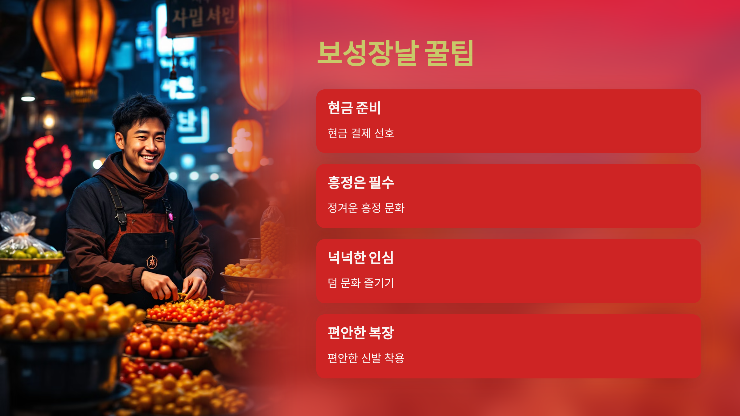 보성 5일장을 제대로 즐기려면 몇 가지 팁을 알고 가면 훨씬 좋아요! 시장 특성상 언제 방문하느냐에 따라 분위기도 다르고, 물건 가격도 달라질 수 있어요. 😊