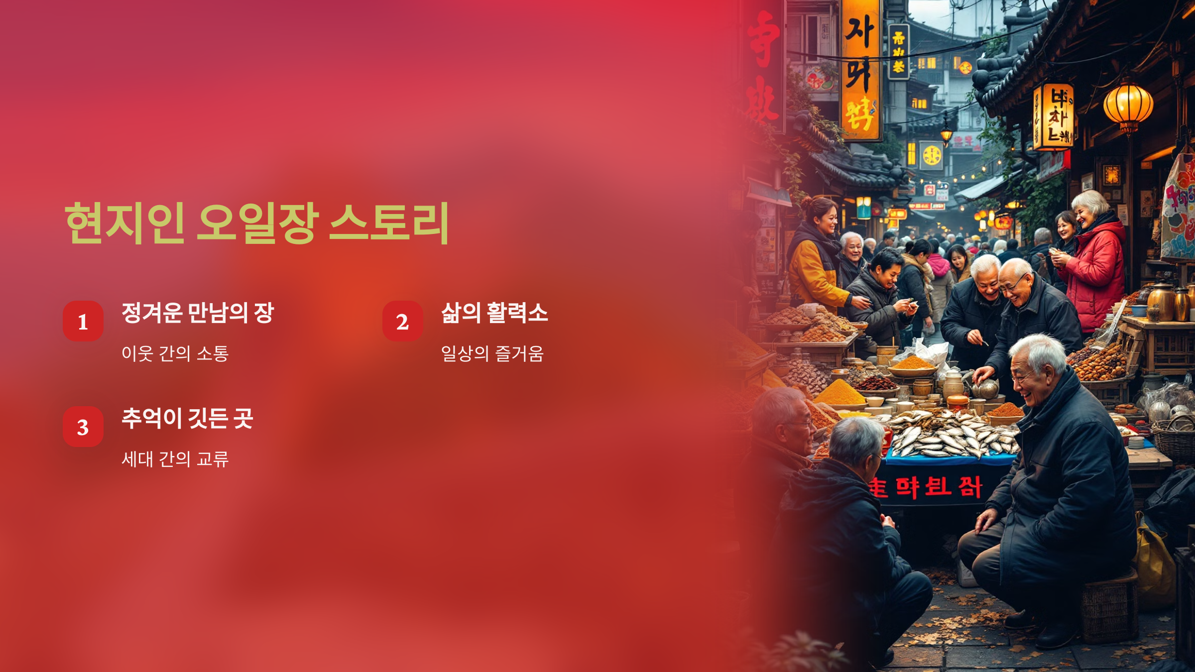 오일장에 가면 장터 한쪽에서 어르신들이 모여 담소를 나누는 모습을 쉽게 볼 수 있어요. 또, 단골 손님과 상인들이 친근하게 인사를 주고받는 모습을 보면 오일장이 얼마나 정겨운 곳인지 느껴질 거예요. 😊
