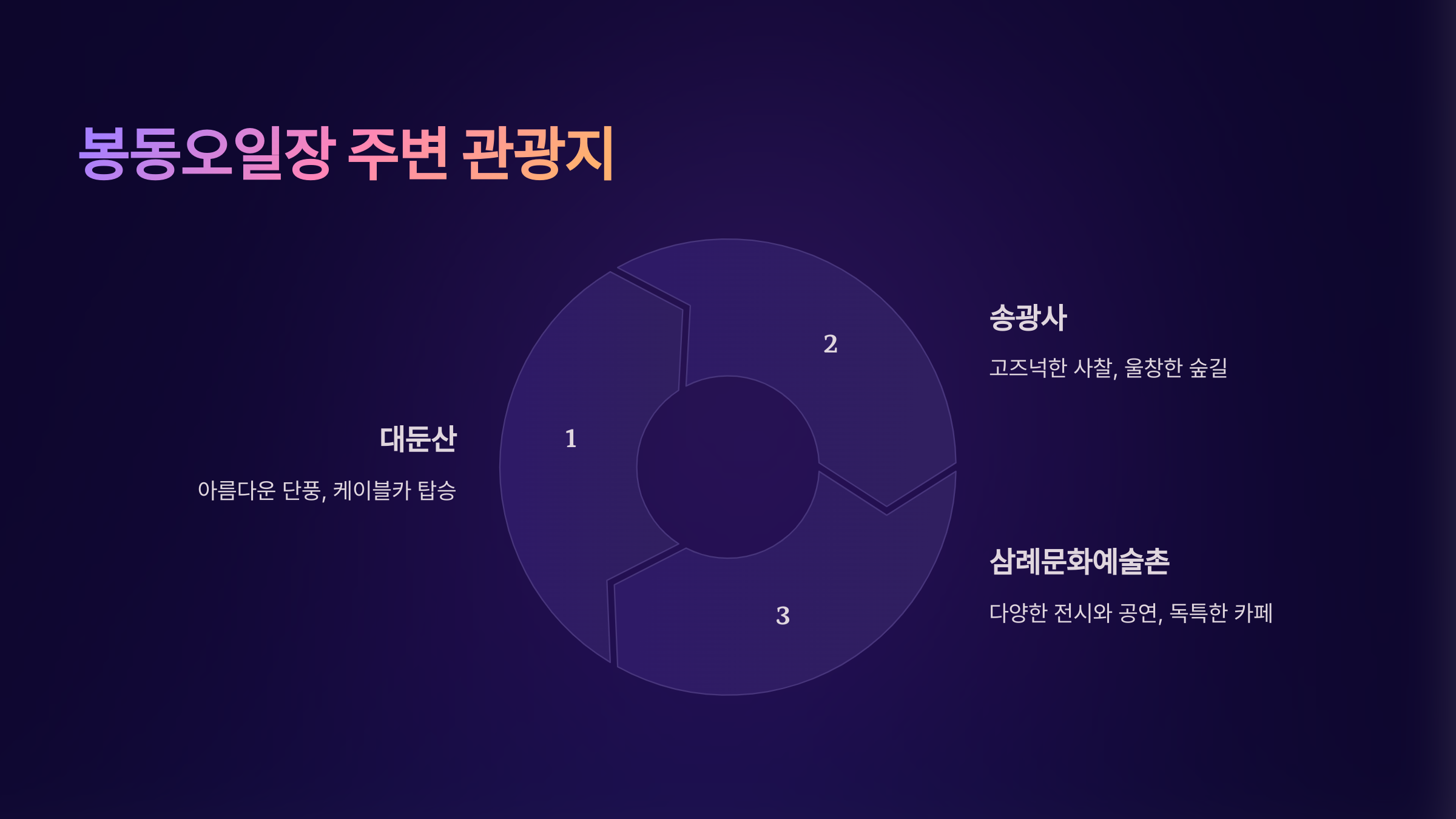 요약: 봉동오일장 주변에는 대둔산, 송광사, 삼례문화예술촌 등 다양한 관광지가 있습니다. 봉동장날 방문과 함께 주변 관광지를 둘러보는 것을 추천합니다.