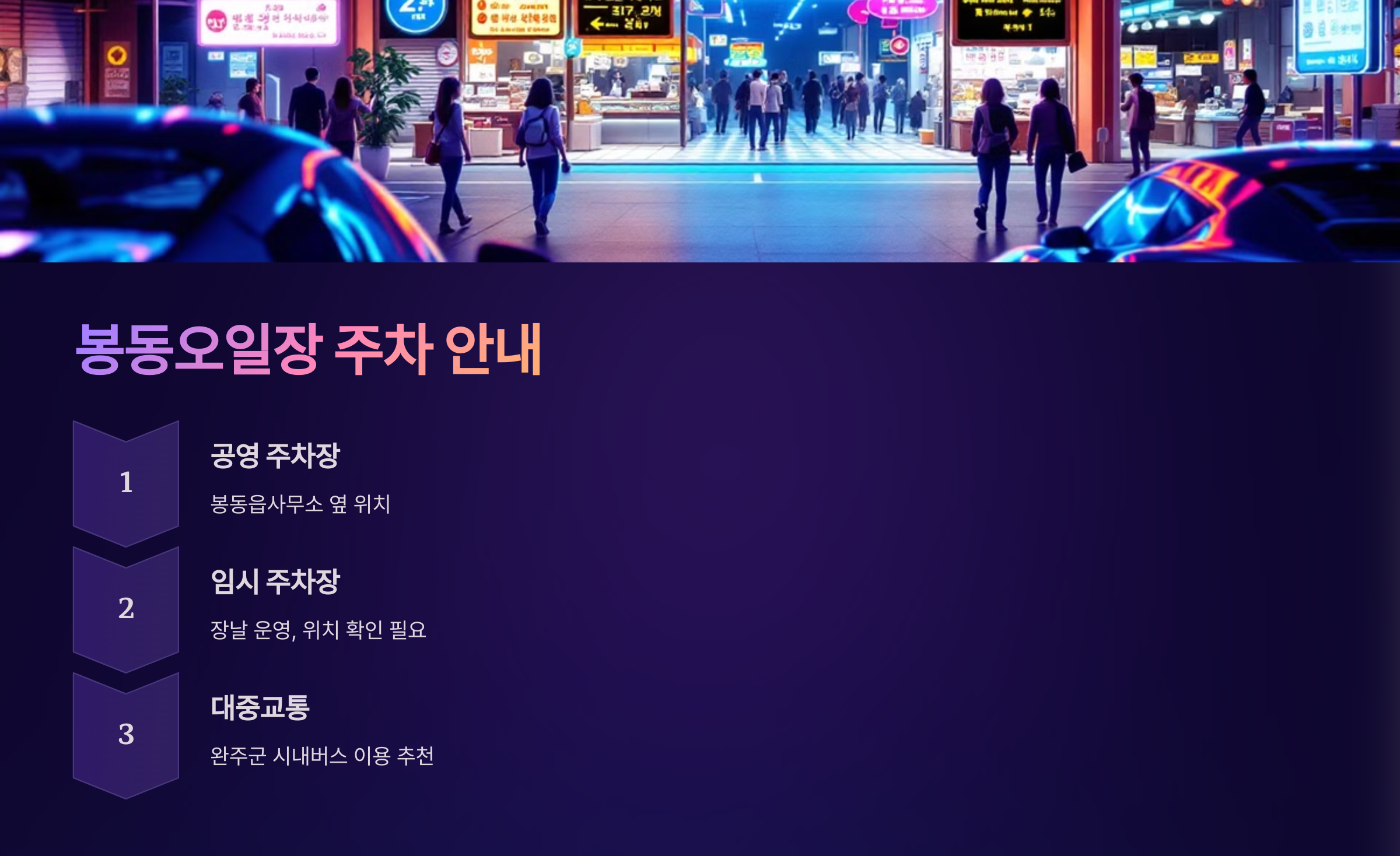 봉동오일장을 방문할 때 가장 큰 어려움 중 하나는 주차 문제입니다. 장날에는 많은 사람들로 붐비기 때문에 주차 공간을 확보하기가 쉽지 않습니다. 하지만 몇 가지 팁을 알아두면 편리하게 주차할 수 있습니다.