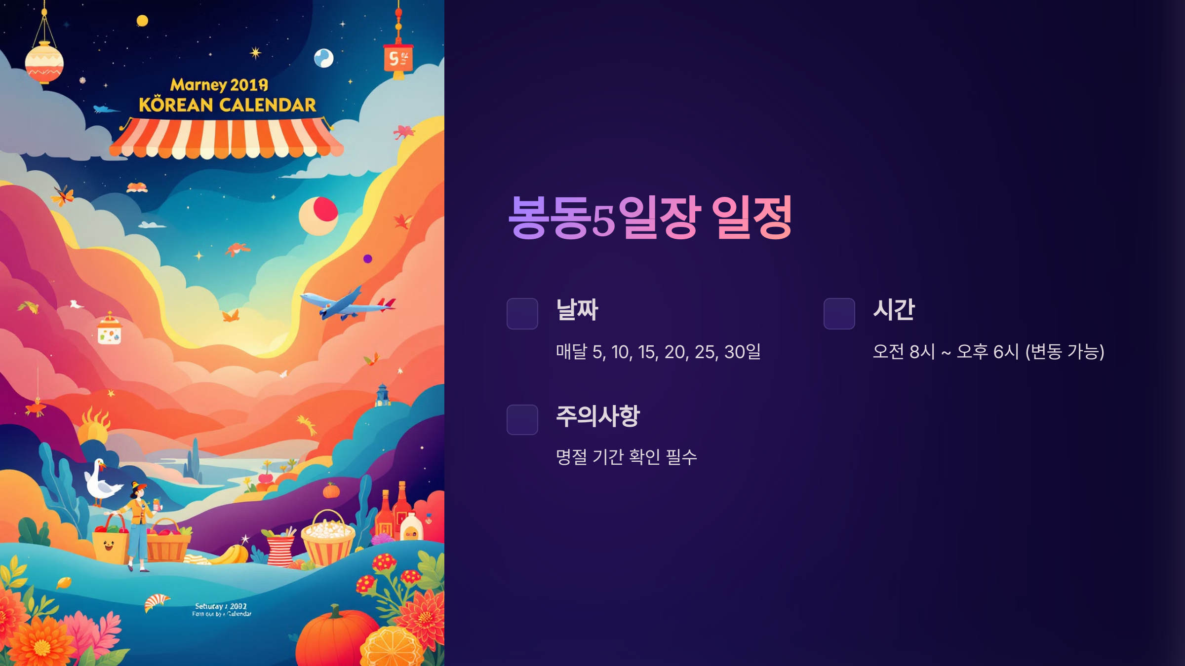 | 주의사항 | 명절 기간에는 장이 열리지 않거나 날짜가 변경될 수 있으므로, 방문 전 확인 필수 |