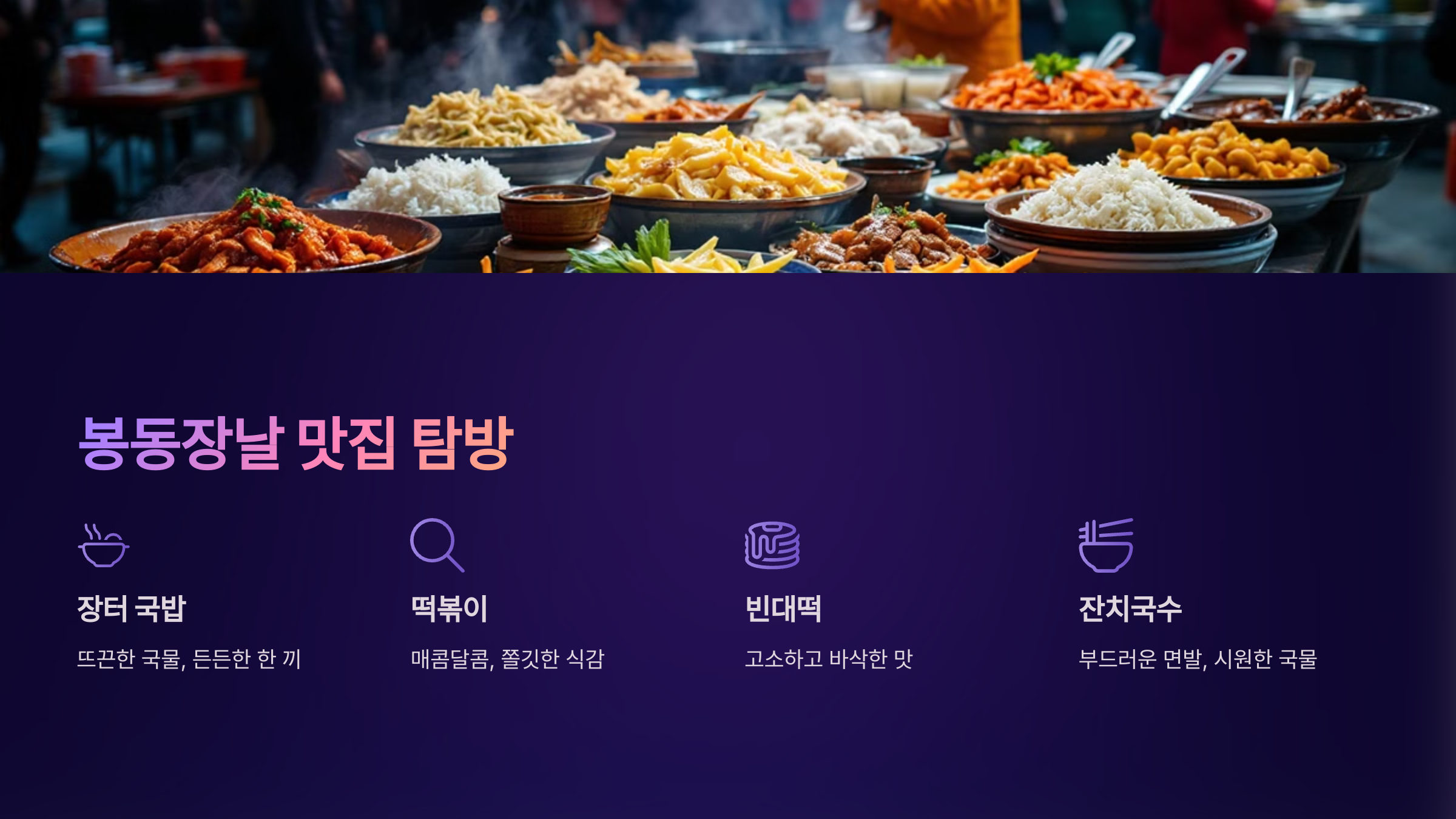 | 다양한 먹거리 | 장터 국밥, 떡볶이, 빈대떡 등 푸짐하고 맛있는 음식을 저렴한 가격에 맛볼 수 있음 |