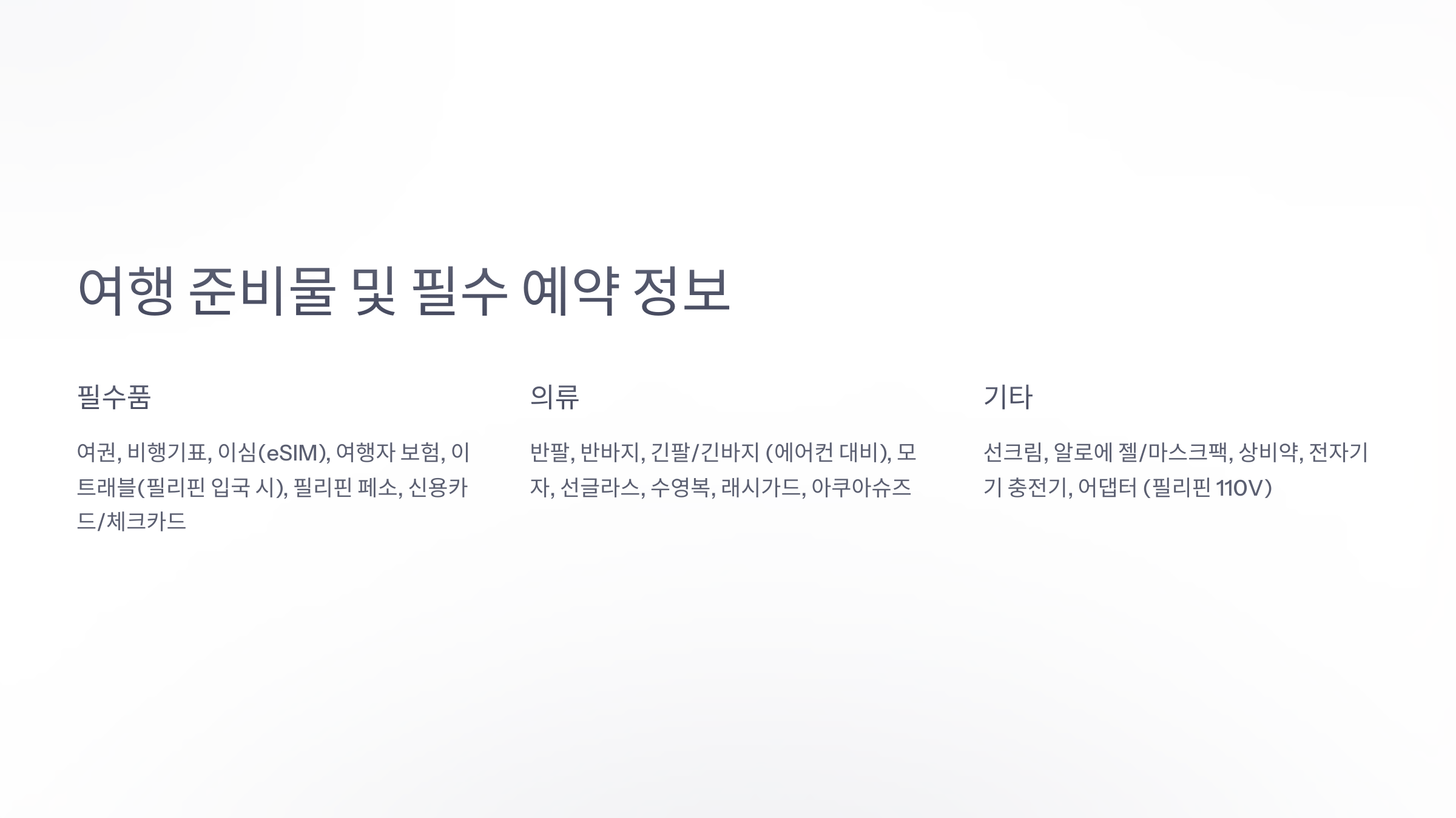 | 필수품 | 여권, 비행기표, 이심(eSIM), 여행자 보험, 이트래블(필리핀 입국 시), 필리핀 페소, 신용카드/체크카드 |