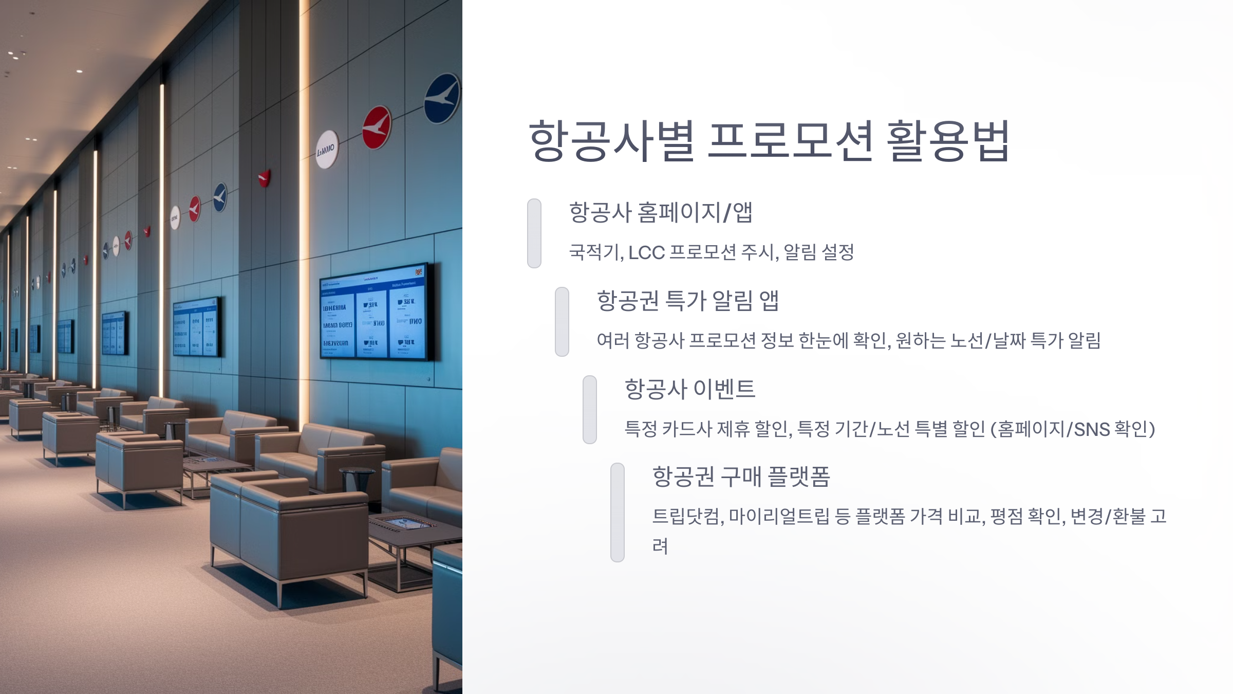 요약: 항공사 프로모션 알림 설정, 가격 비교 플랫폼 활용, 사전 준비 철저, 취소표 공략, 다양한 방법 활용