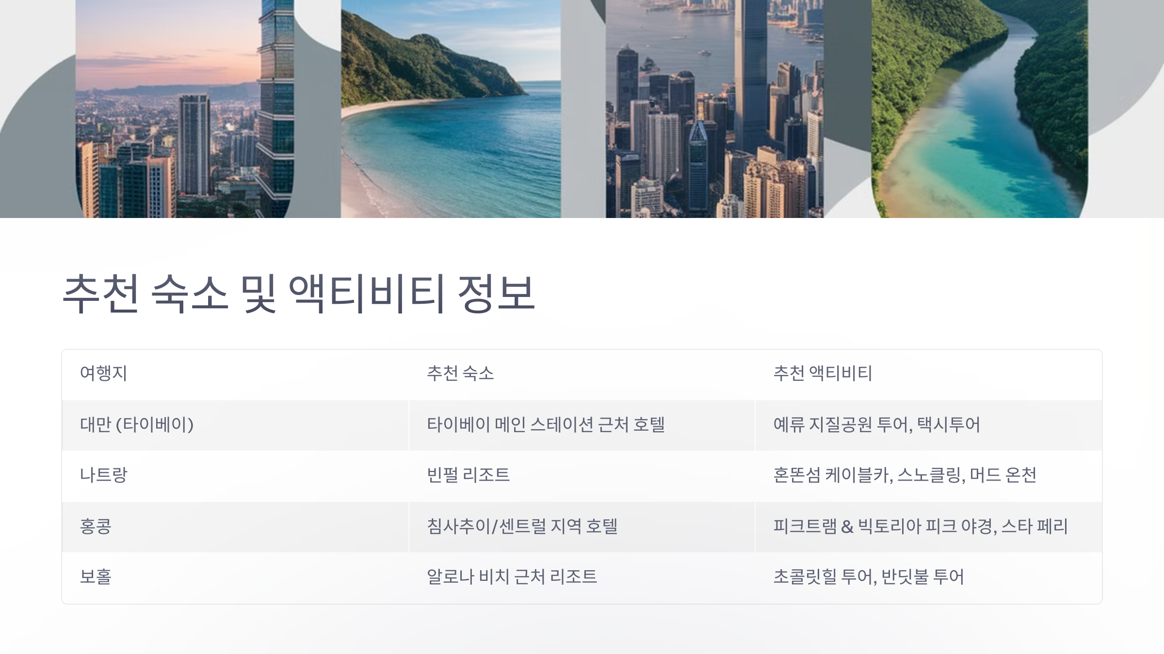 | 경비 | 대만, 나트랑, 홍콩, 보홀은 유럽보다 물가 저렴, 쇼핑/액티비티 계획 시 예산 넉넉히 |