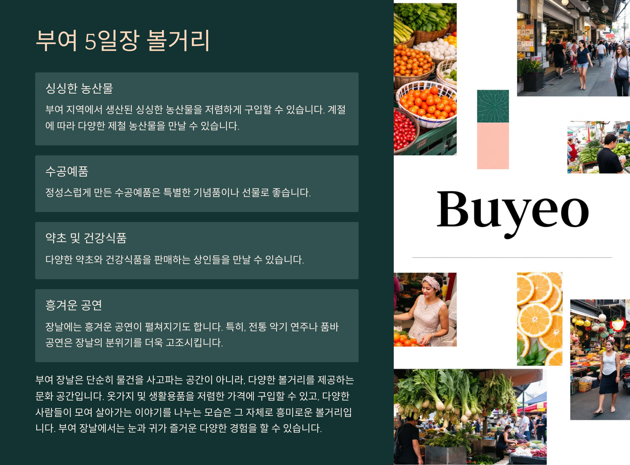 부여는 백제의 숨결이 살아 숨 쉬는 역사적인 도시입니다. 이곳에서는 현대적인 모습과 더불어 전통적인 시장의 활기를 느낄 수 있는 특별한 경험을 할 수 있습니다. 바로 부여 장날, 부여 5일장입니다. 싱싱한 농산물과 다채로운 먹거리, 그리고 정겨운 사람들의 이야기가 가득한 부여 장날은 단순한 시장을 넘어 지역 문화의 중심지 역할을 하고 있습니다. 이 글에서는 부여 장날에 대한 모든 것을 상세하게 안내하여 여러분의 방문을 더욱 풍성하고 즐겁게 만들어 드리겠습니다. 부여 오일장을 방문하기 전에 꼭 확인해야 할 정보들을 지금부터 함께 알아볼까요?