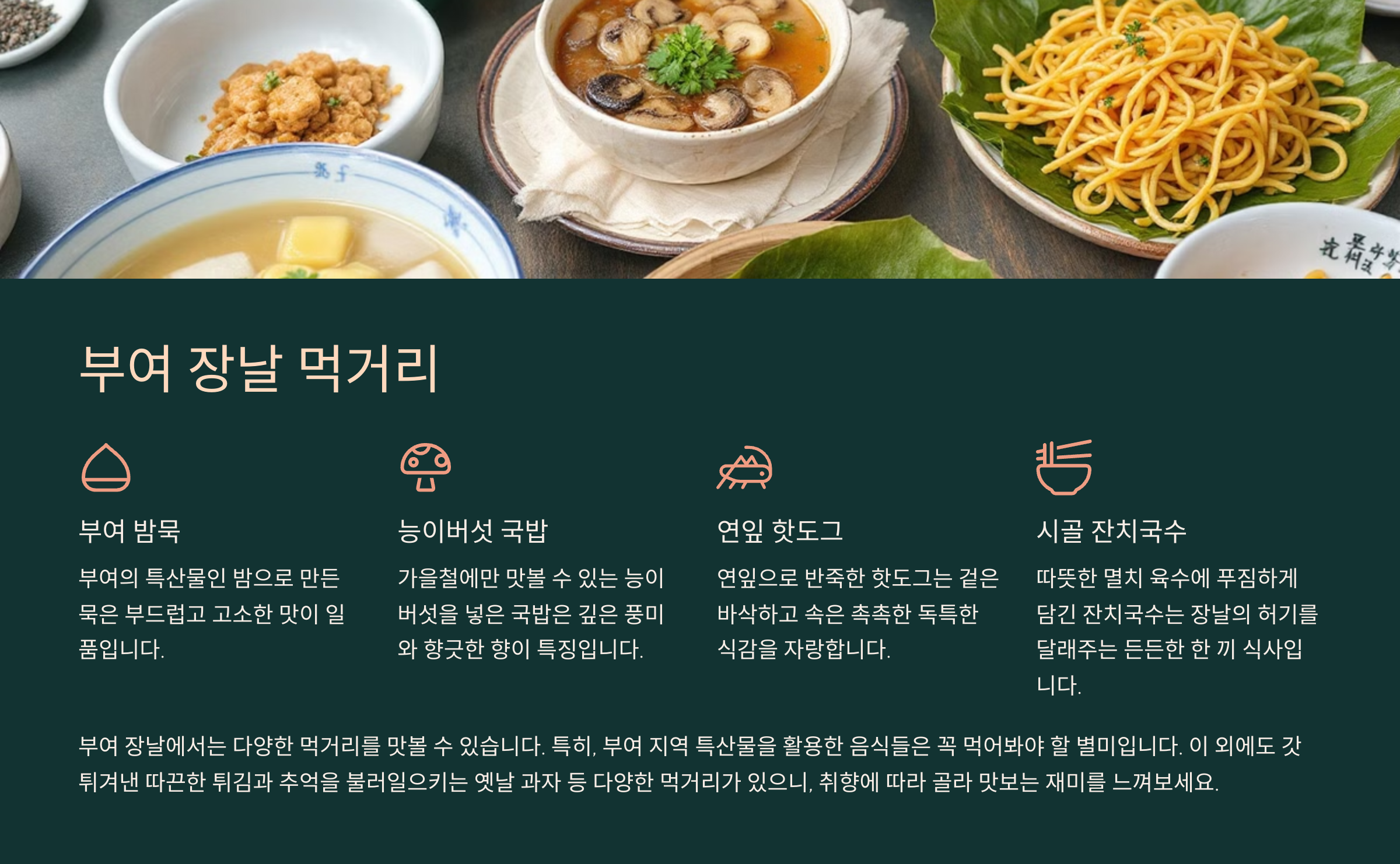 | 밤묵 | 부여 특산물인 밤으로 만든 묵, 고소하고 부드러운 맛 |