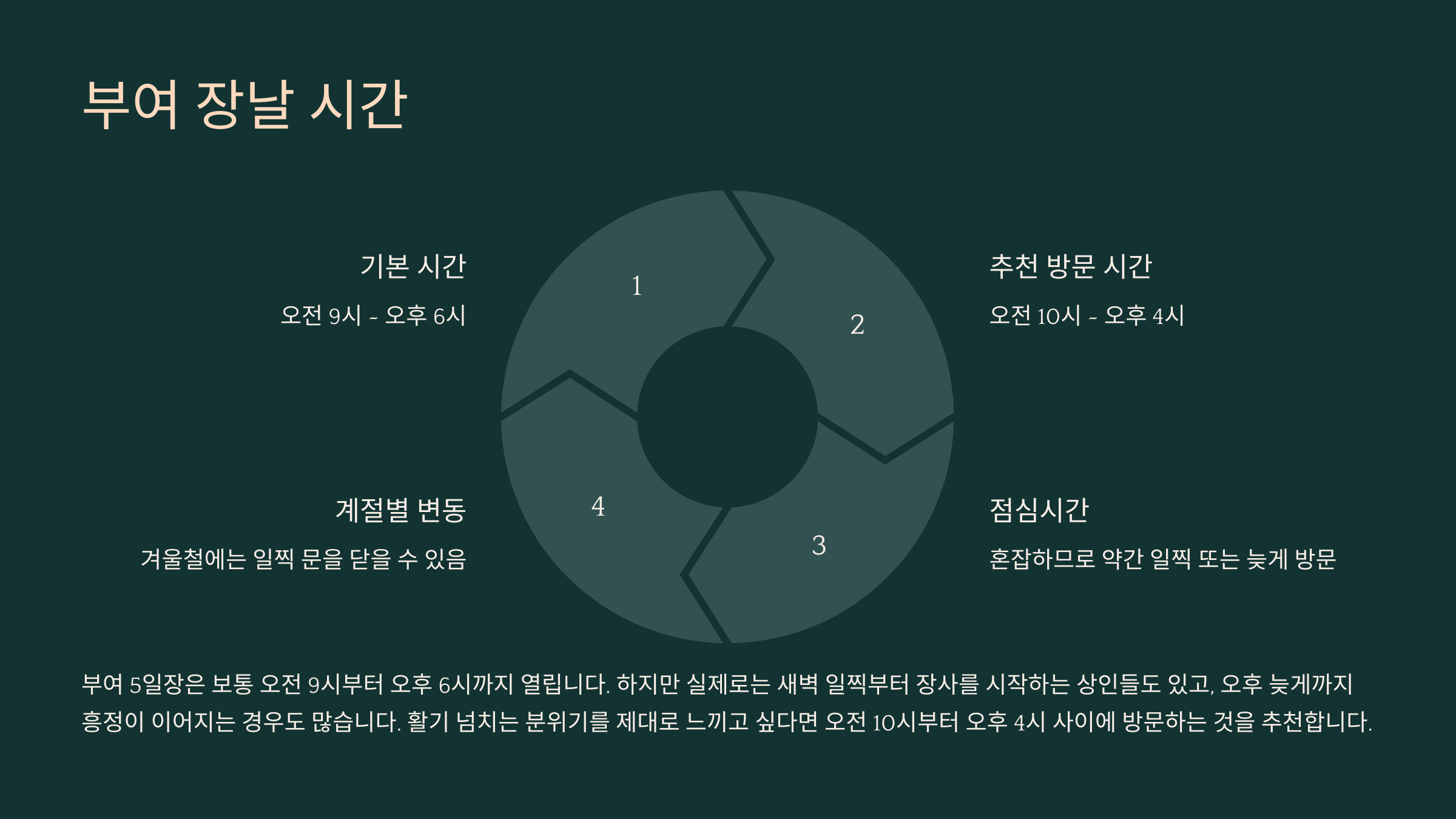 계절에 따라 장날 운영 시간이 약간씩 변동될 수 있습니다. 특히, 겨울철에는 해가 짧아지는 관계로 일찍 문을 닫는 경우가 많으니, 방문 전에 부여군청이나 관련 기관에 문의하여 정확한 시간을 확인하는 것이 좋습니다.