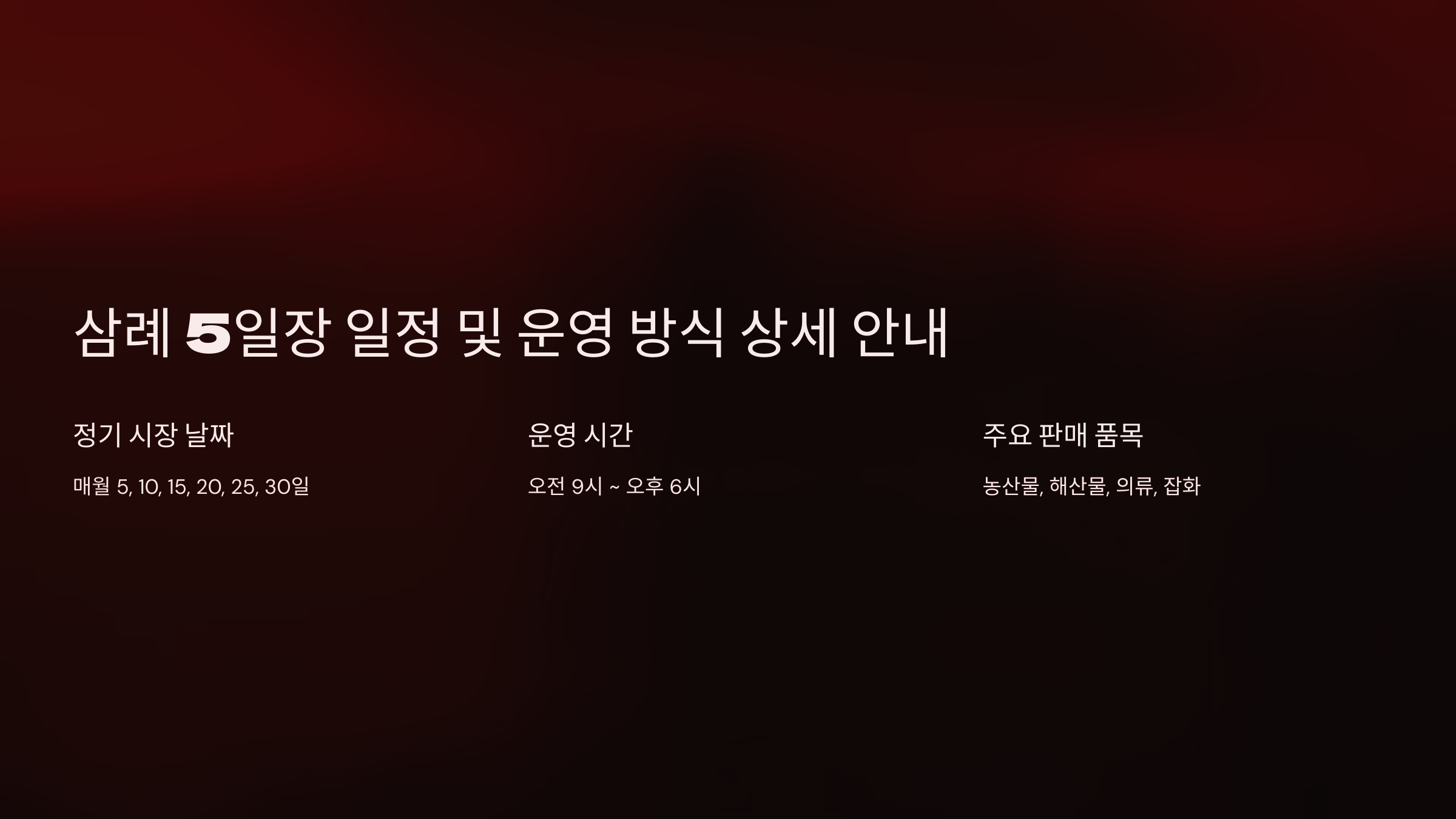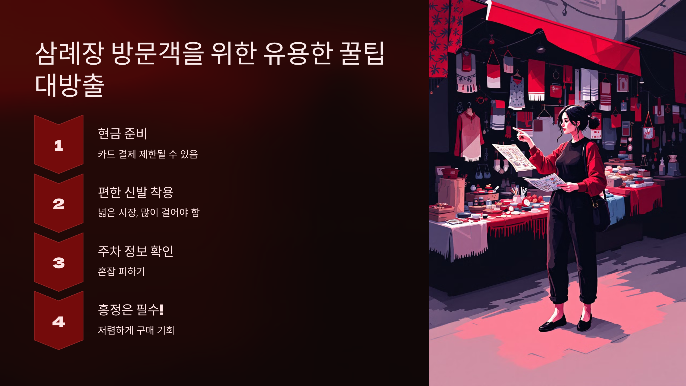 삼례 5일장을 제대로 즐기려면 몇 가지 팁을 알아두면 좋아요. 장날은 사람이 많고 다양한 물건이 한꺼번에 쏟아지기 때문에 준비를 잘하면 더욱 알차게 쇼핑할 수 있어요.