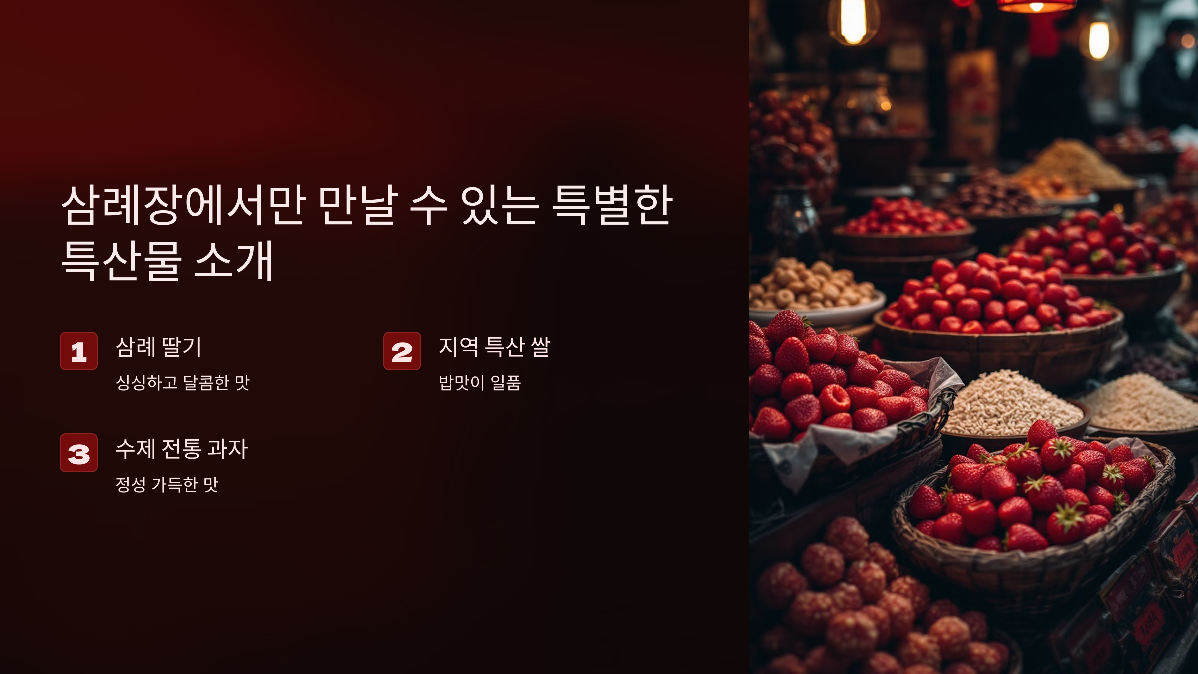 삼례 5일장에서는 완주 지역의 특산물을 한자리에서 만날 수 있어요. 이 지역은 농업이 발달해 신선한 농산물이 많고, 전통 방식으로 만든 식품들도 다양해요.