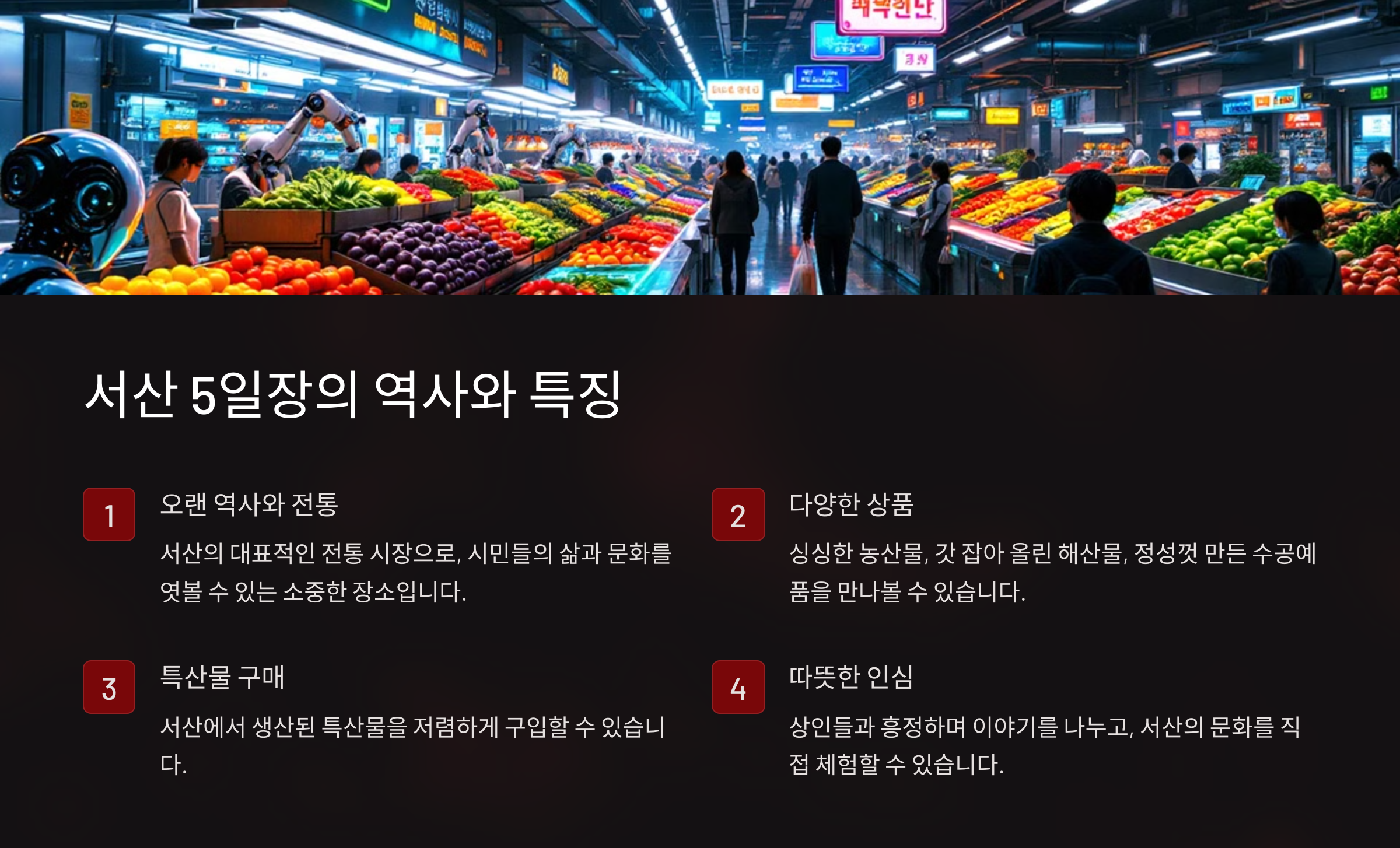 A: 일부 상점에서는 카드 결제가 가능하지만, 대부분 현금 결제를 선호합니다. 방문 전 현금을 준비해 가는 것이 좋습니다. - Q: 서산 장날에 반려동물과 함께 방문해도 되나요?