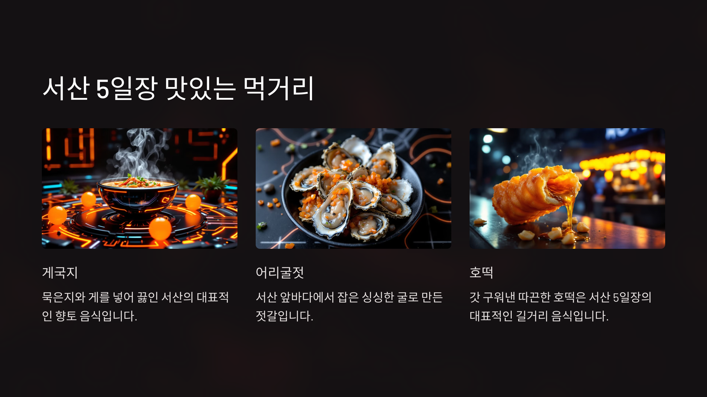 서산 5일장에는 다양한 먹거리가 가득합니다. 특히, 서산의 특산물을 이용한 음식들은 꼭 맛봐야 할 별미입니다.