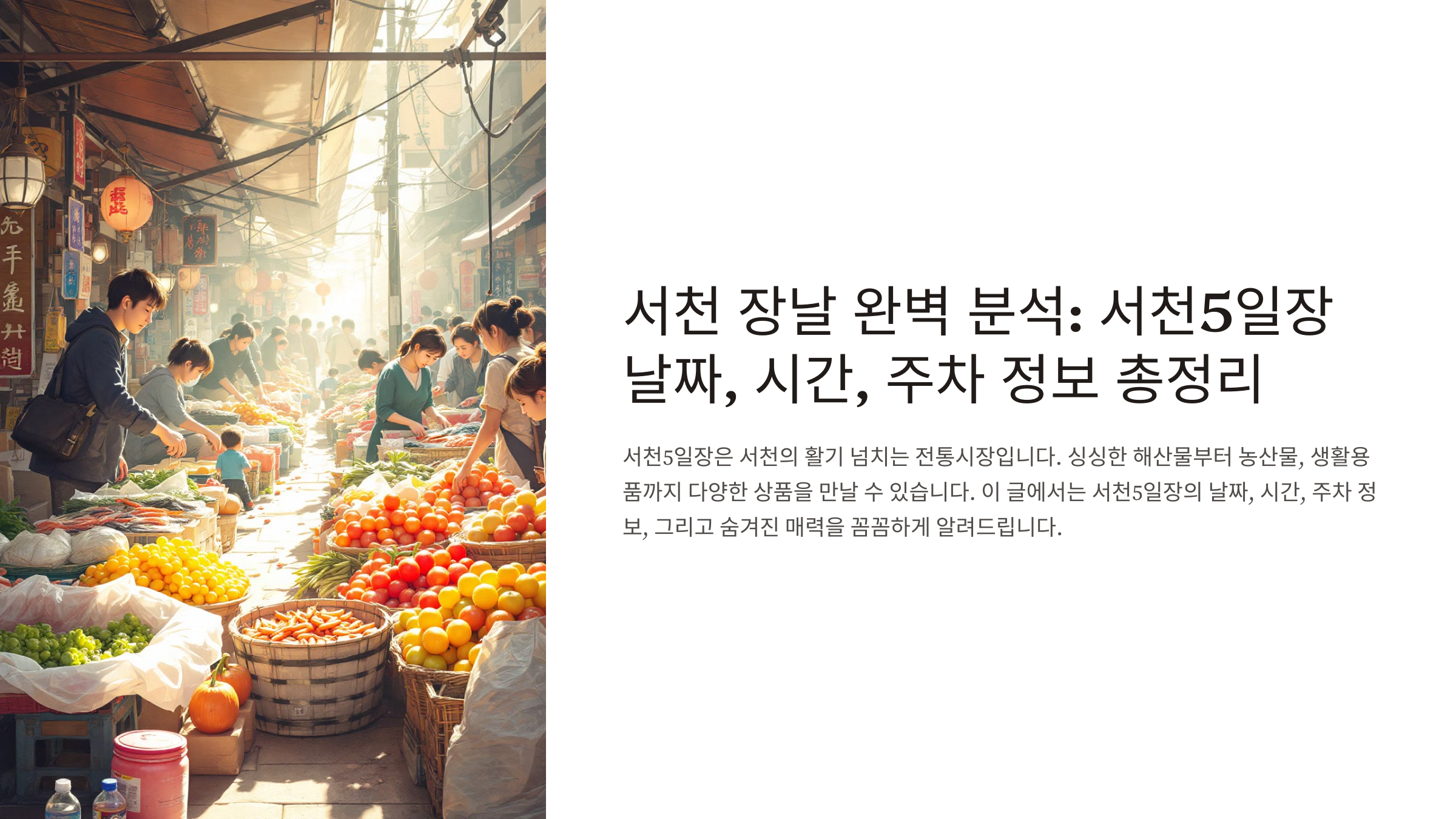 서천의 활기 넘치는 전통시장, 서천 장날! 서천의 정겨움을 느낄 수 있는 서천5일장은 싱싱한 해산물부터 농산물, 생활용품까지 다양한 상품을 만날 수 있는 곳입니다. 하지만 언제 열리는지, 어디에 주차해야 하는지 몰라 방문을 망설였다면 걱정 마세요! 이 글에서는 서천5일장 날짜부터 시간, 주차 정보, 그리고 숨겨진 매력까지 꼼꼼하게 알려드립니다. 서천오일장 방문을 계획하고 있다면 이 글을 통해 알찬 정보를 얻어가세요.