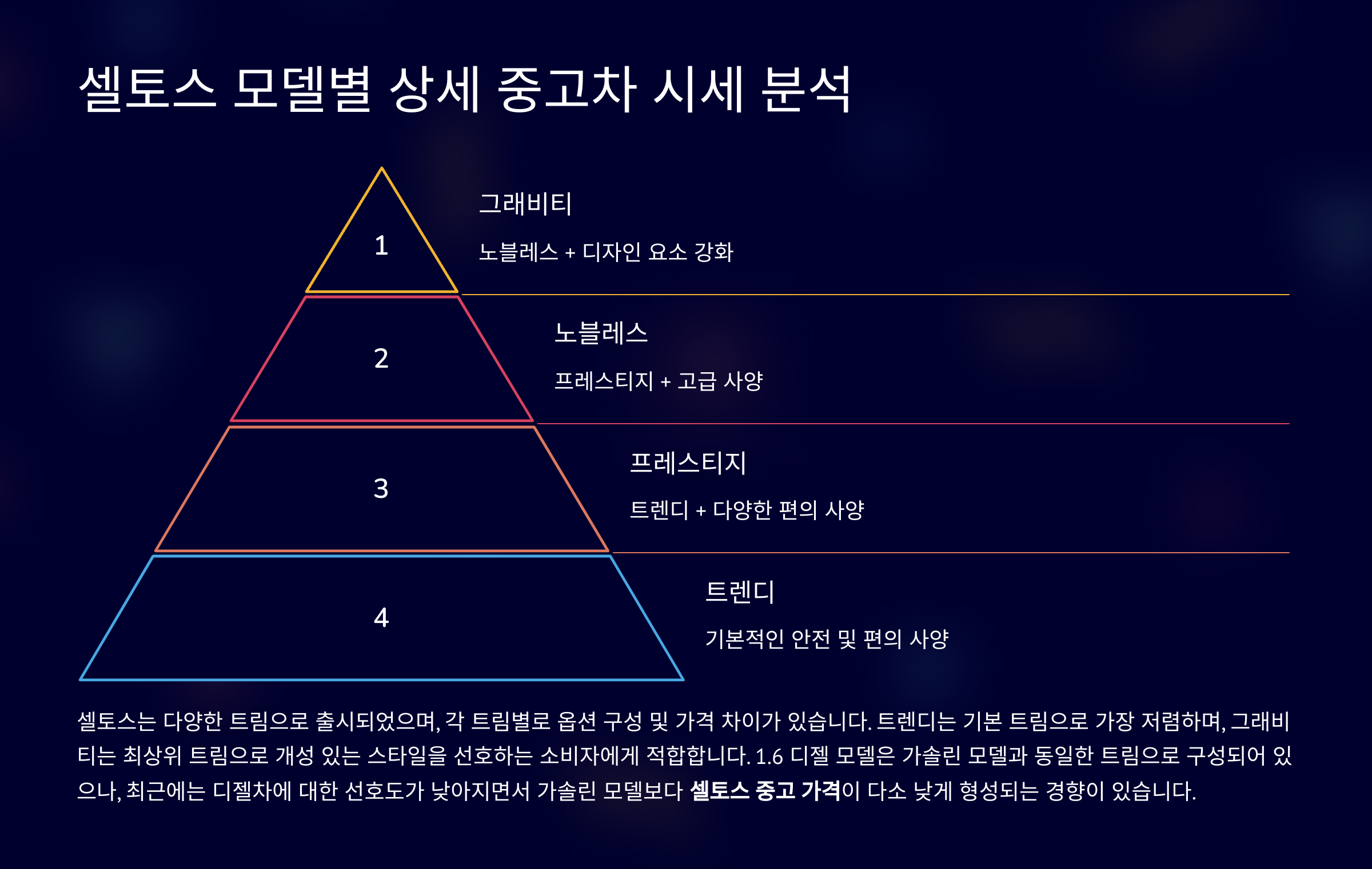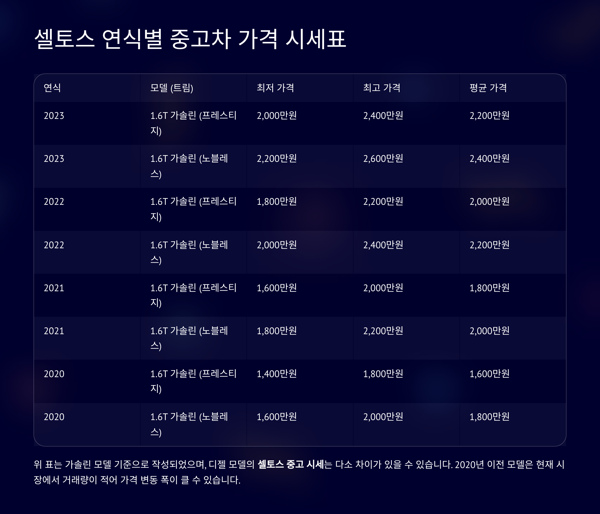 참고: 위 표는 가솔린 모델 기준으로 작성되었으며, 디젤 모델의 셀토스 중고 시세는 다소 차이가 있을 수 있습니다. 또한, 2020년 이전 모델은 현재 시장에서 거래량이 적어 가격 변동 폭이 클 수 있습니다.