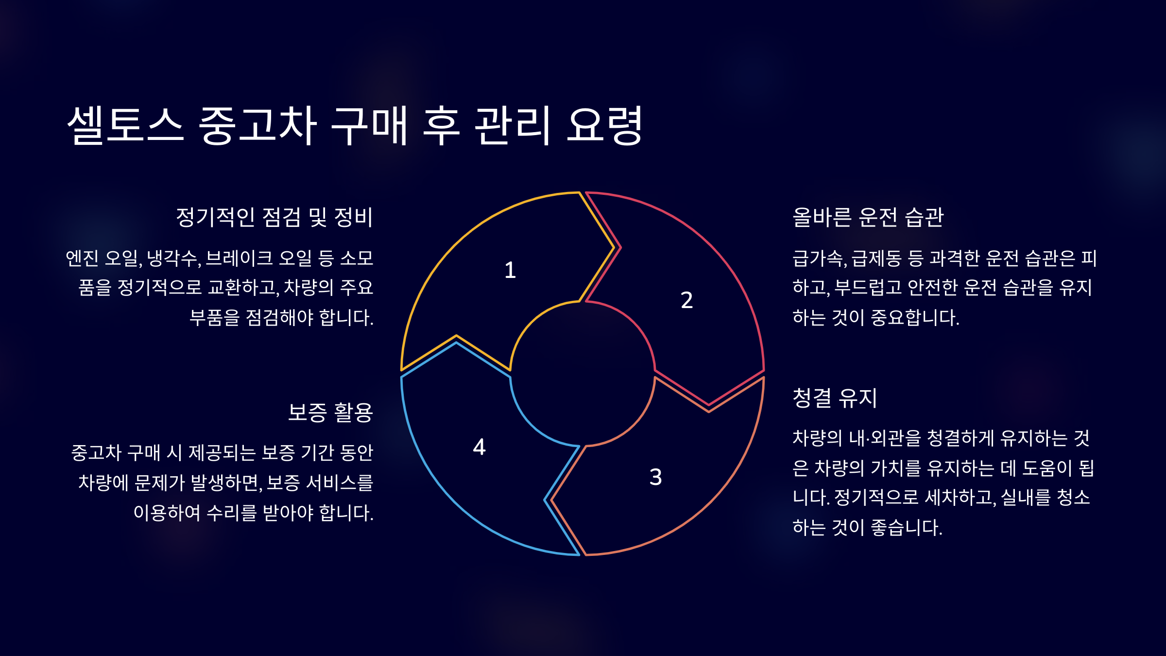- 보증 활용: 중고차 구매 시 제공되는 보증 기간 동안 차량에 문제가 발생하면, 보증 서비스를 이용하여 수리를 받아야 합니다.