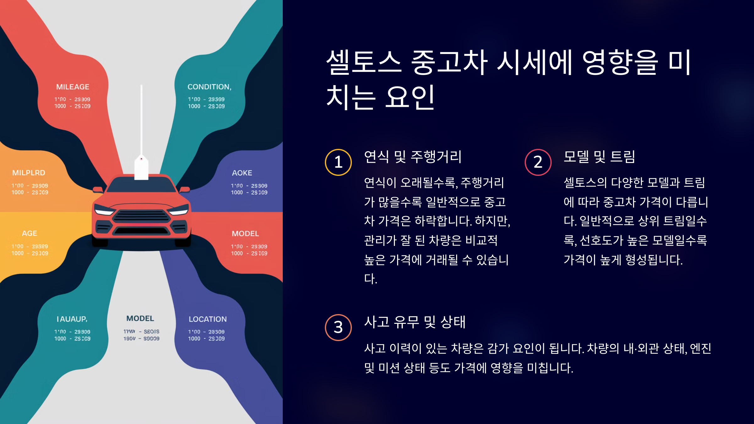 - 색상: 선호도가 높은 색상(흰색, 검은색 등)의 차량은 다른 색상의 차량보다 높은 가격에 거래될 수 있습니다.