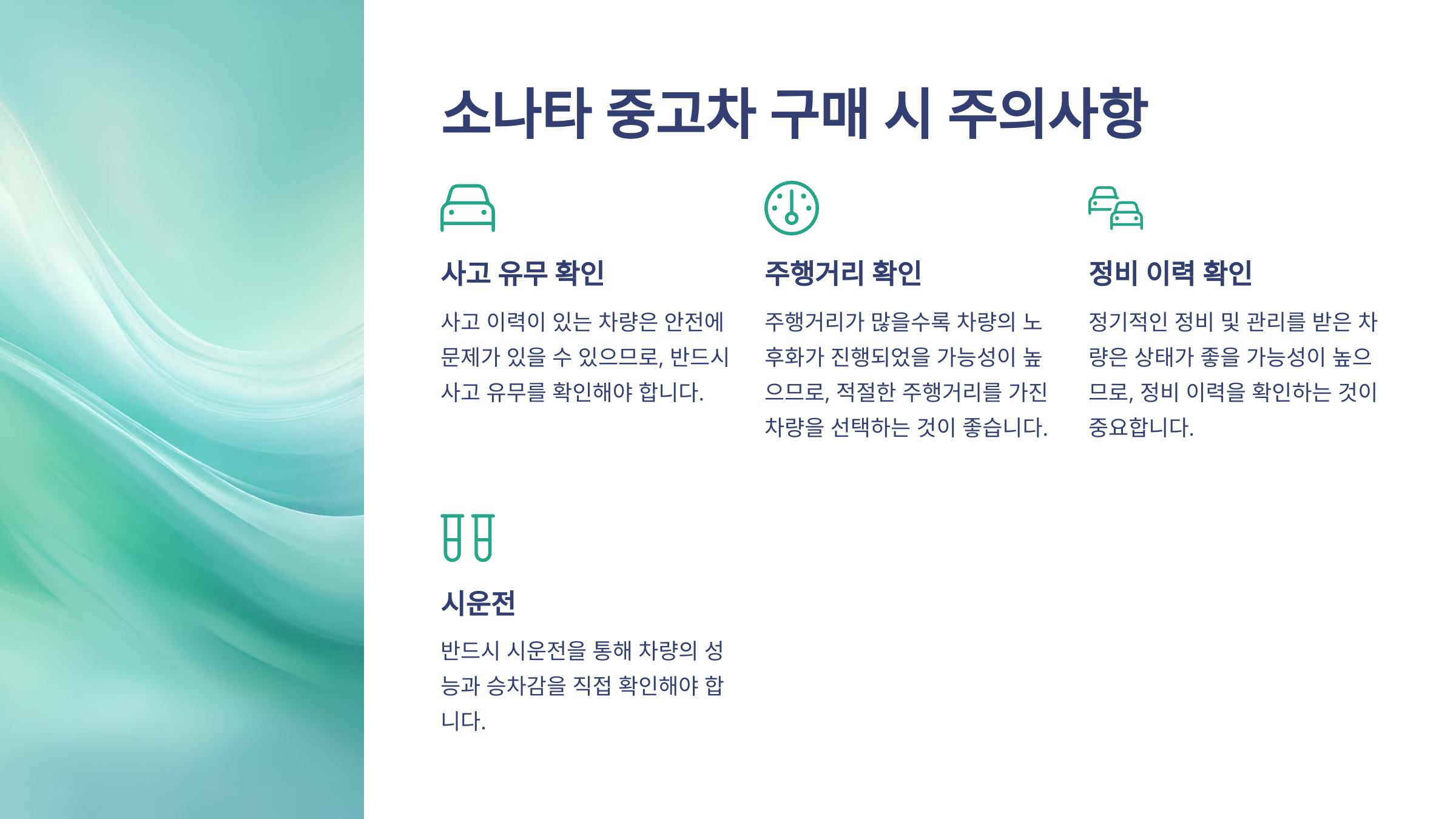 - 시운전: 반드시 시운전을 통해 차량의 성능과 승차감을 확인해야 합니다.
