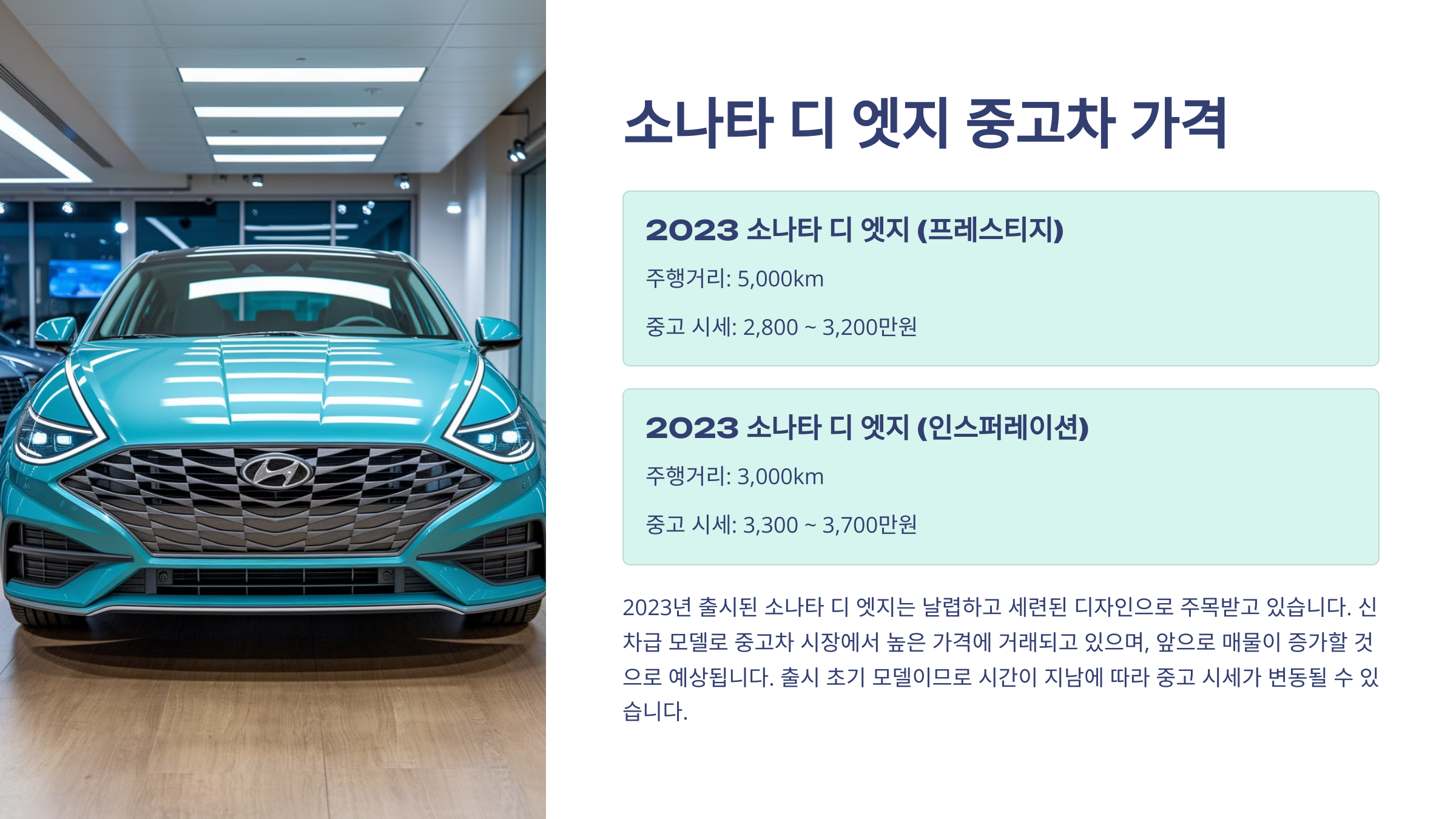 2023년 출시된 소나타 디 엣지는 더욱 날렵하고 세련된 디자인으로 많은 관심을 받고 있습니다. 신차급 모델인 만큼 중고차 시장에서도 높은 가격에 거래되고 있습니다. 소나타 디 엣지는 출시된 지 얼마 되지 않아 중고차 매물이 많지 않지만, 앞으로 꾸준히 매물이 증가할 것으로 예상됩니다.