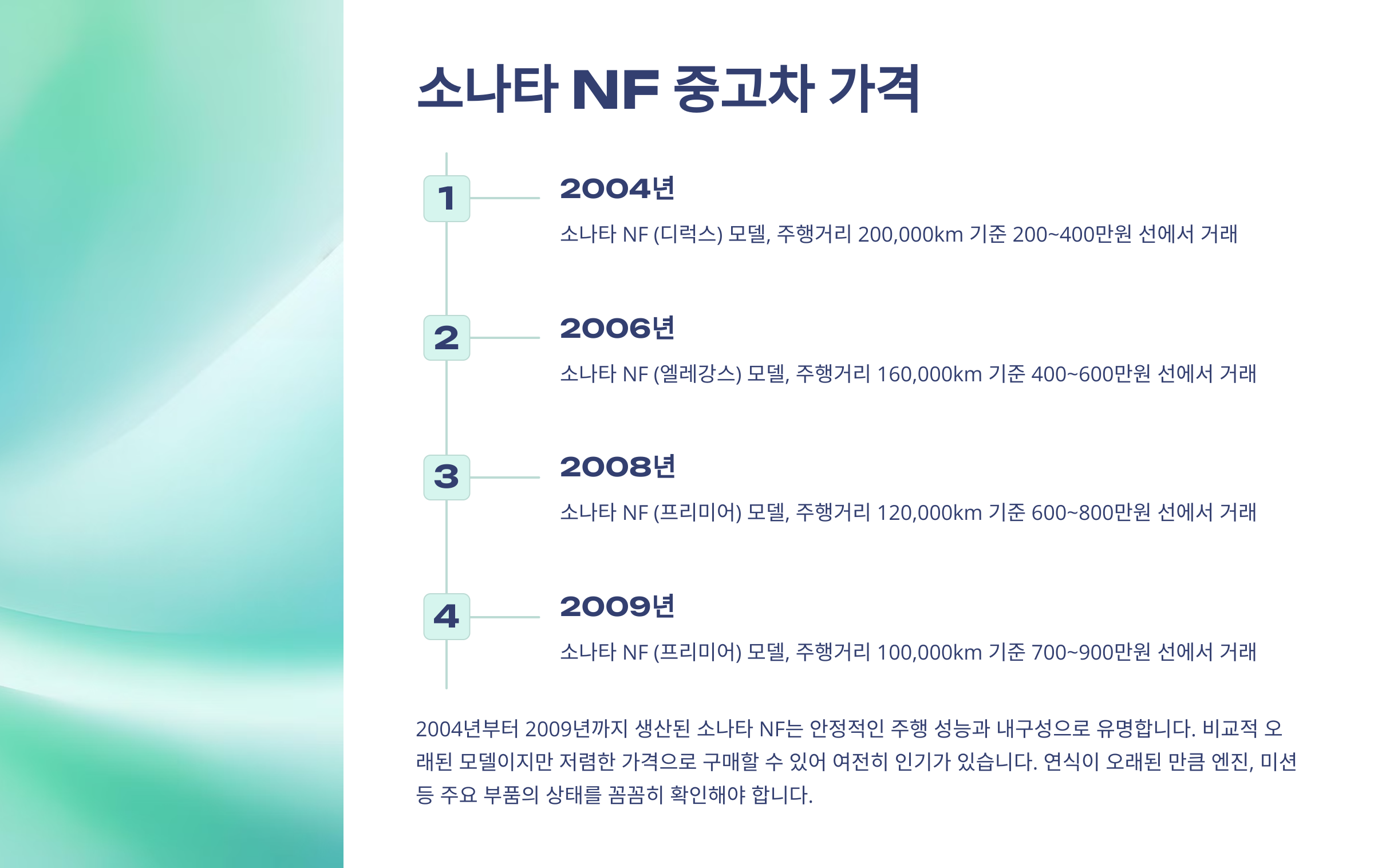 주의사항: 소나타 NF는 연식이 오래된 만큼, 엔진, 미션 등 주요 부품의 상태를 꼼꼼하게 확인해야 합니다.