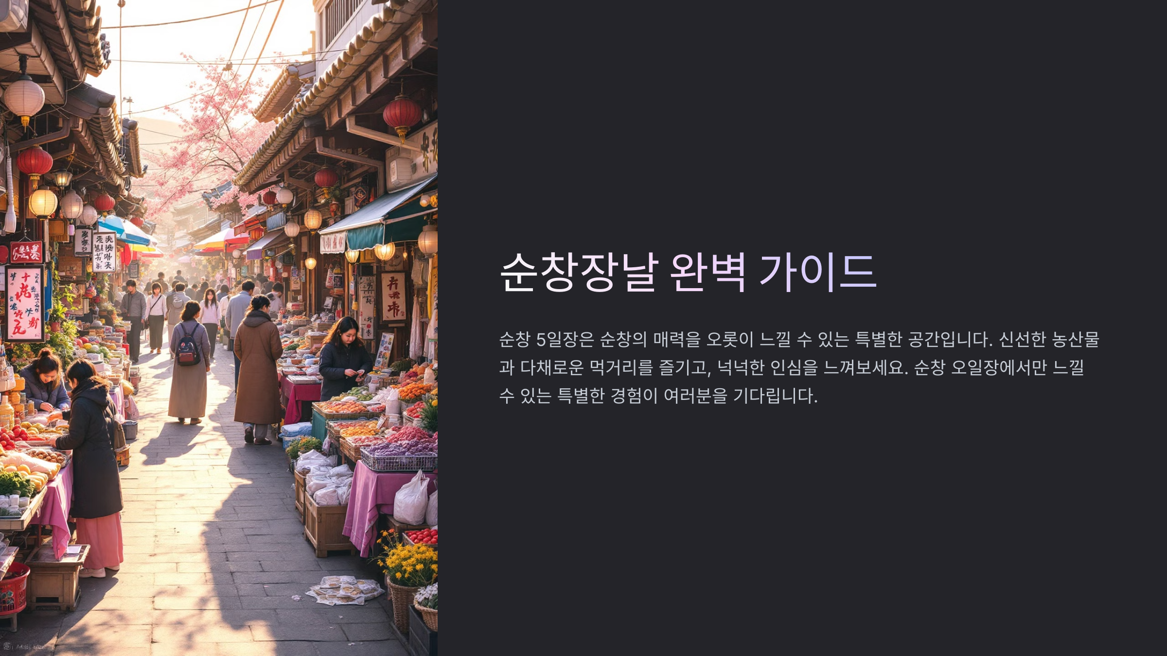 전라북도 순창의 활기 넘치는 전통시장, 순창장날! 순창 5일장은 순창의 매력을 오롯이 느낄 수 있는 특별한 공간입니다. 순창의 정겨운 풍경 속에서 신선한 농산물과 다채로운 먹거리를 즐기고, 넉넉한 인심을 느껴보세요. 순창 오일장은 단순한 장터를 넘어, 순창 사람들의 삶과 문화를 엿볼 수 있는 소중한 경험을 선사합니다. 순창 5일장을 제대로 즐기기 위한 모든 정보를 이 글에 담았습니다.