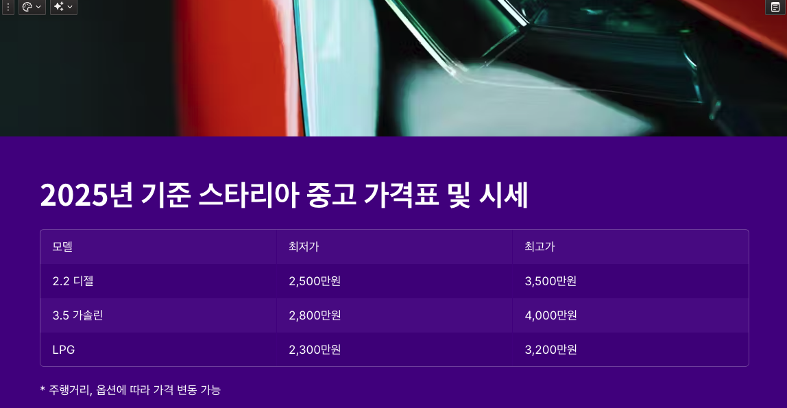 A1. 2025년 2월 기준, 스타리아 중고차 가격은 모델과 주행거리에 따라 2,800만 원~6,000만 원 수준이에요.