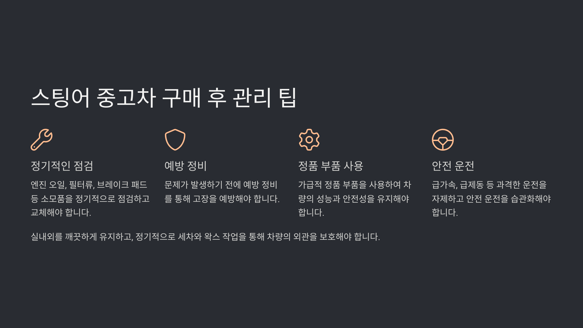 스팅어 중고차를 구매한 후에는 꾸준한 관리를 통해 차량의 수명을 연장하고 최상의 상태를 유지하는 것이 중요합니다.