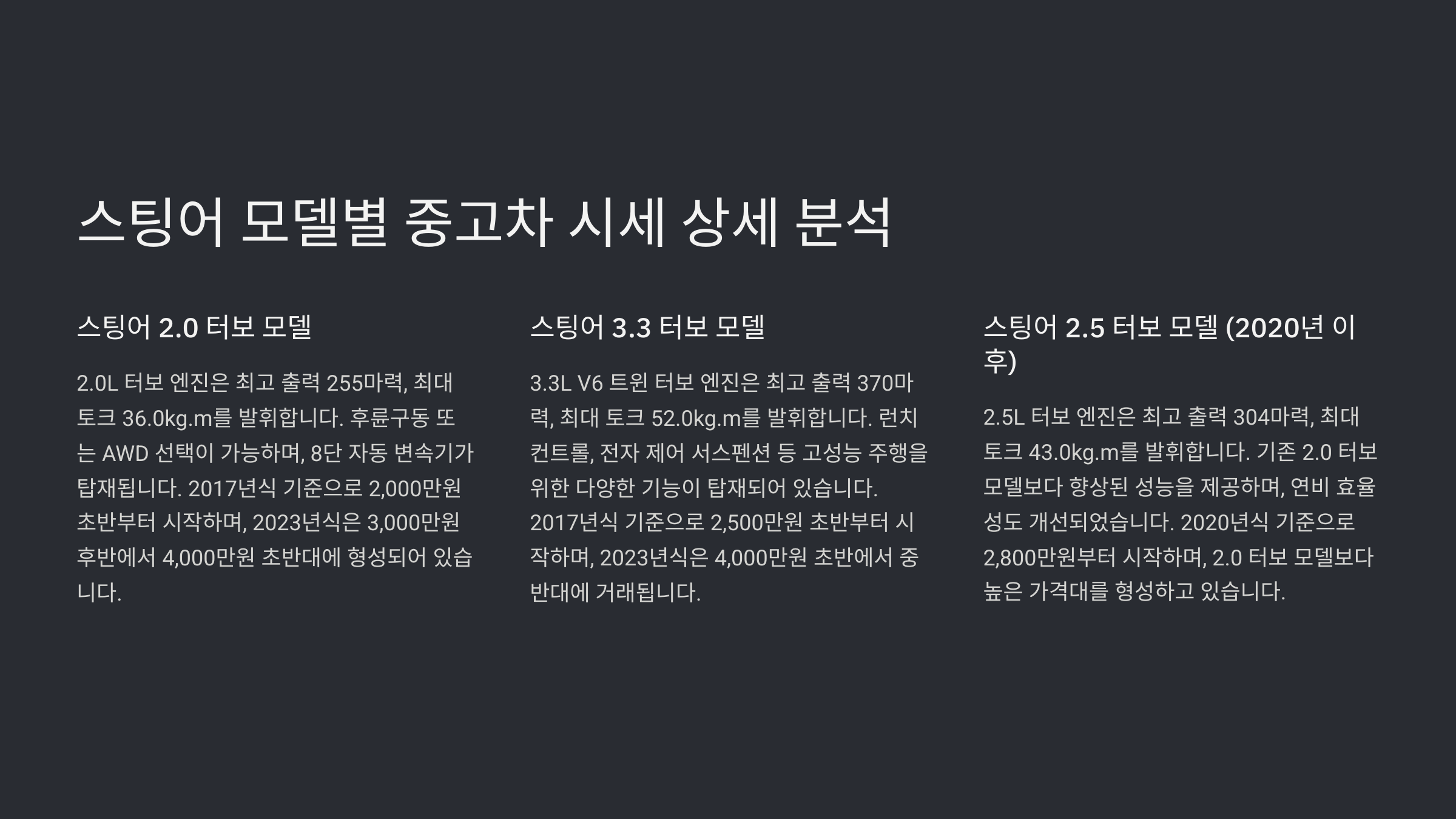 스팅어는 다양한 트림과 엔진 옵션으로 출시되었습니다. 각 모델별 특징과 스팅어 중고 가격 시세를 자세히 알아보겠습니다.