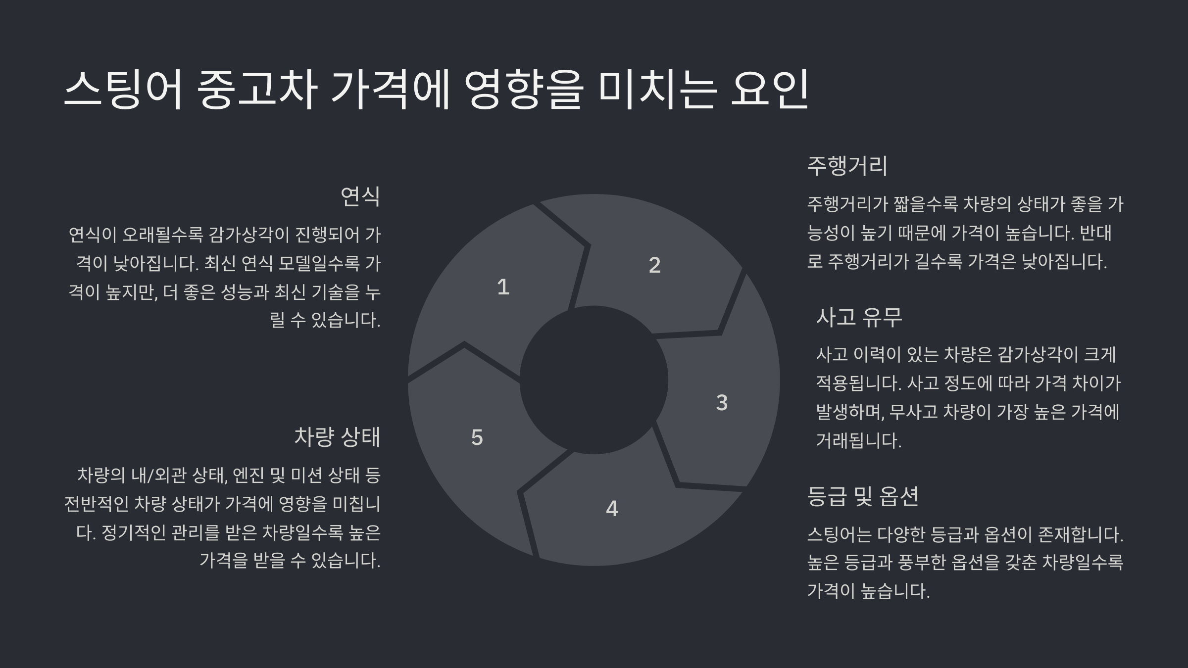 스팅어 중고차 가격은 여러 요인에 따라 변동합니다. 주요 요인들을 이해하면 스팅어 중고 시세를 더욱 정확하게 파악하고, 합리적인 가격에 구매하는 데 도움이 될 것입니다.