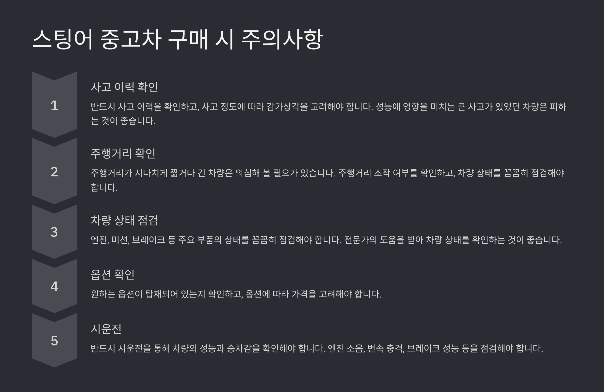 스팅어 중고차를 구매할 때는 다음과 같은 사항에 주의해야 합니다.