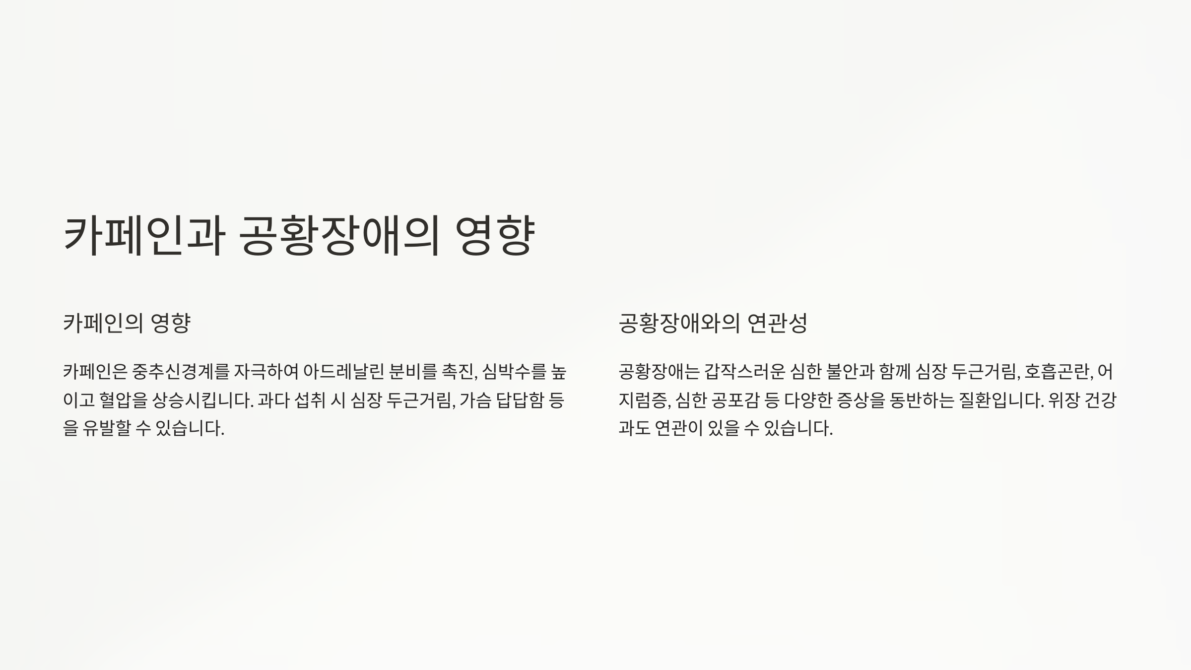 카페인은 중추신경계를 자극하여 아드레날린 분비를 촉진, 심박수를 높이고 혈압을 상승시키는 역할을 합니다. 과다 섭취 시 심장 두근거림, 가슴 답답함 등을 유발할 수 있으며, 카페인에 민감한 사람일수록 더 적은 양으로도 증상을 느낄 수 있습니다.