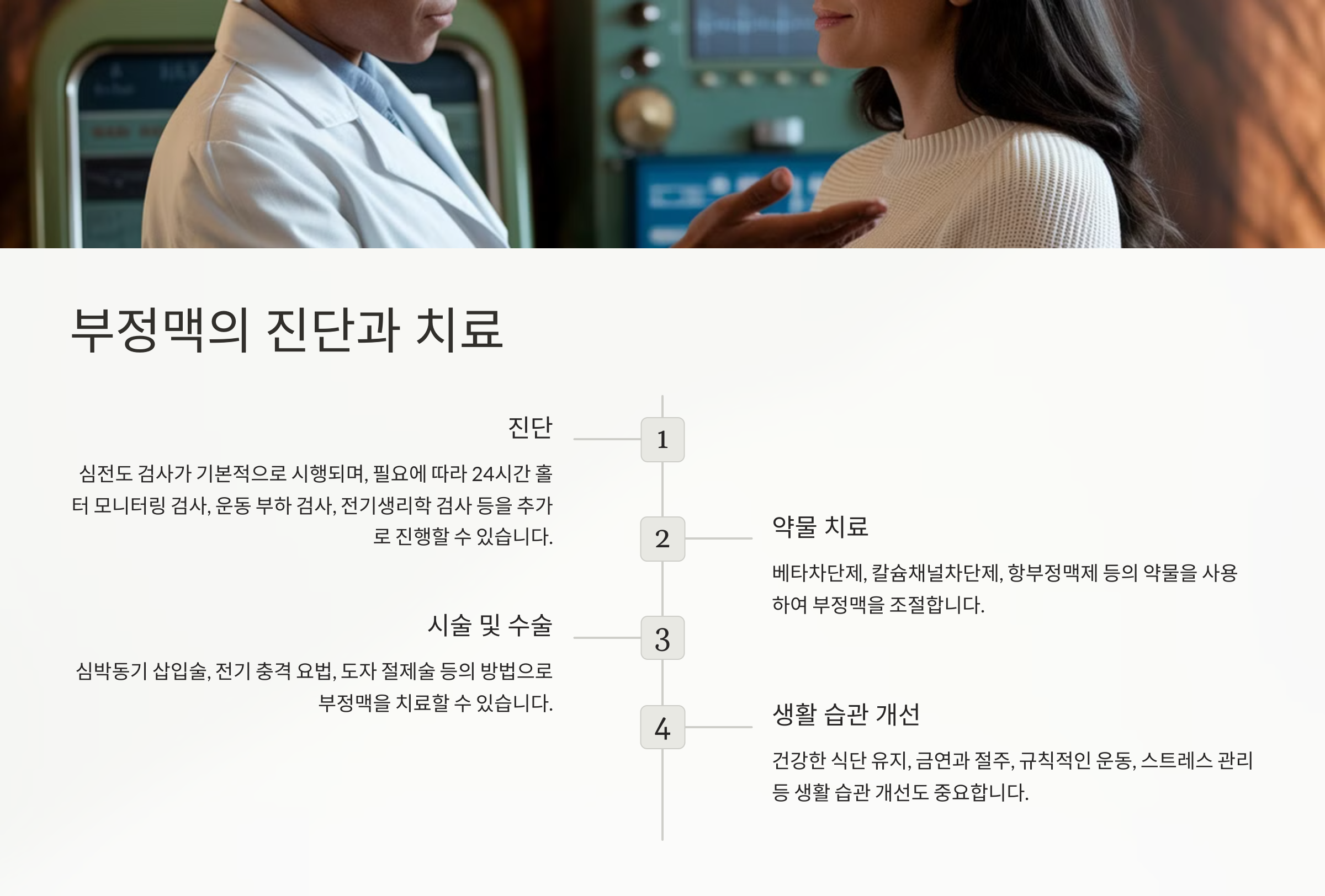 부정맥 치료와 함께 건강한 식단 유지, 금연과 절주, 규칙적인 운동, 카페인과 알코올 섭취 줄이기, 충분한 수면, 스트레스 관리 등 생활 습관 개선도 중요합니다. 갑상선 질환, 빈혈, 고혈압 등 부정맥을 유발할 수 있는 기저 질환이 있다면 반드시 치료를 병행해야 합니다.