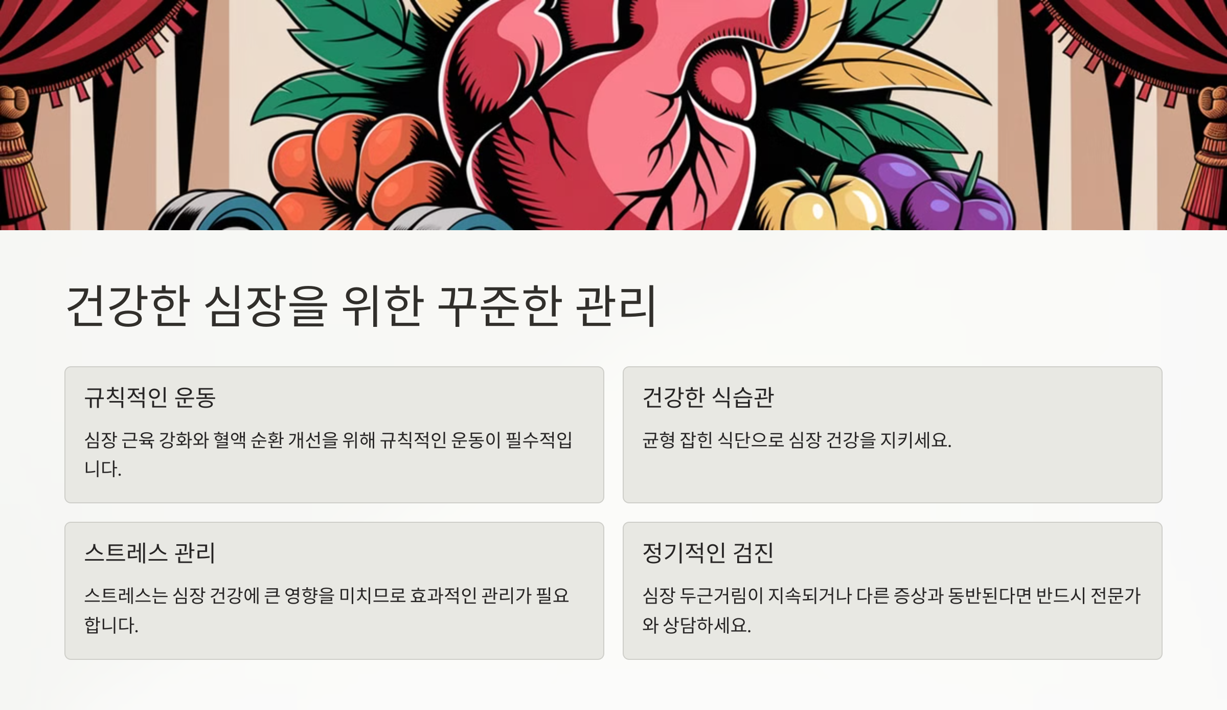 - 심리적 안정: 긍정적인 마음을 유지하고 즐거운 활동을 통해 스트레스를 해소하는 것이 심장 건강에 도움이 됩니다.