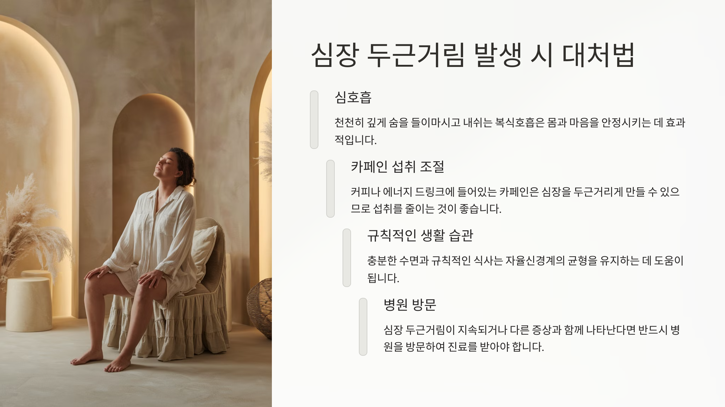 - 병원 방문: 심장 두근거림이 계속되거나 숨 가쁨, 현기증, 가슴 통증과 같은 다른 증상들이 함께 나타난다면 병원을 방문하여 진료를 받아보는 것이 좋습니다. 갑상선 기능이나 전해질 불균형, 빈혈 등 다른 원인이 있을 수도 있습니다.