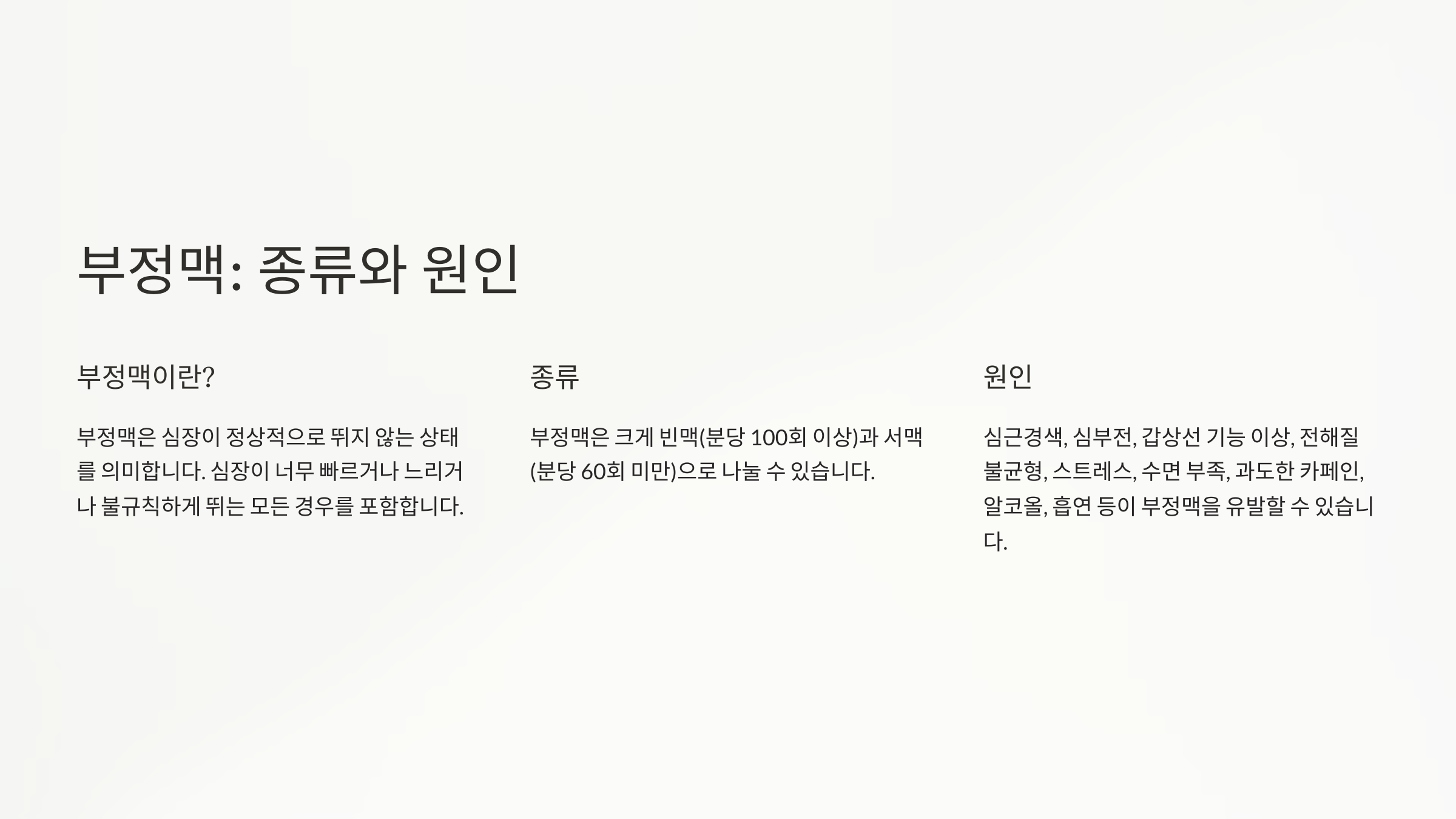 부정맥은 심장이 정상적으로 뛰지 않는 상태를 의미하며, 심장이 너무 빠르거나 느리거나 불규칙하게 뛰는 모든 경우를 포함합니다. 부정맥은 크게 빈맥(분당 100회 이상)과 서맥(분당 60회 미만)으로 나눌 수 있습니다.