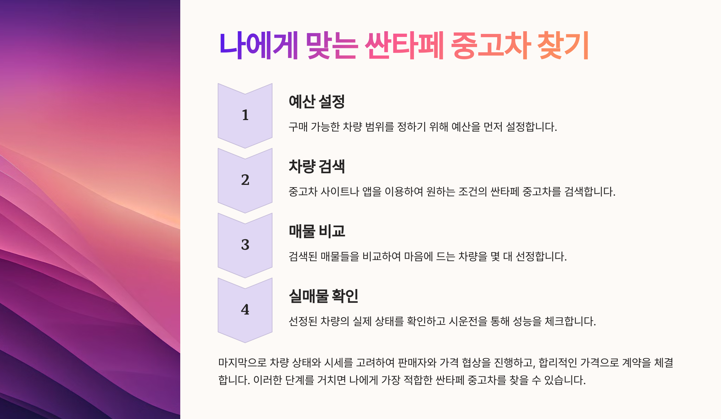 나에게 맞는 싼타페 중고차를 찾기 위해서는 다음과 같은 단계를 거치는 것이 좋습니다.