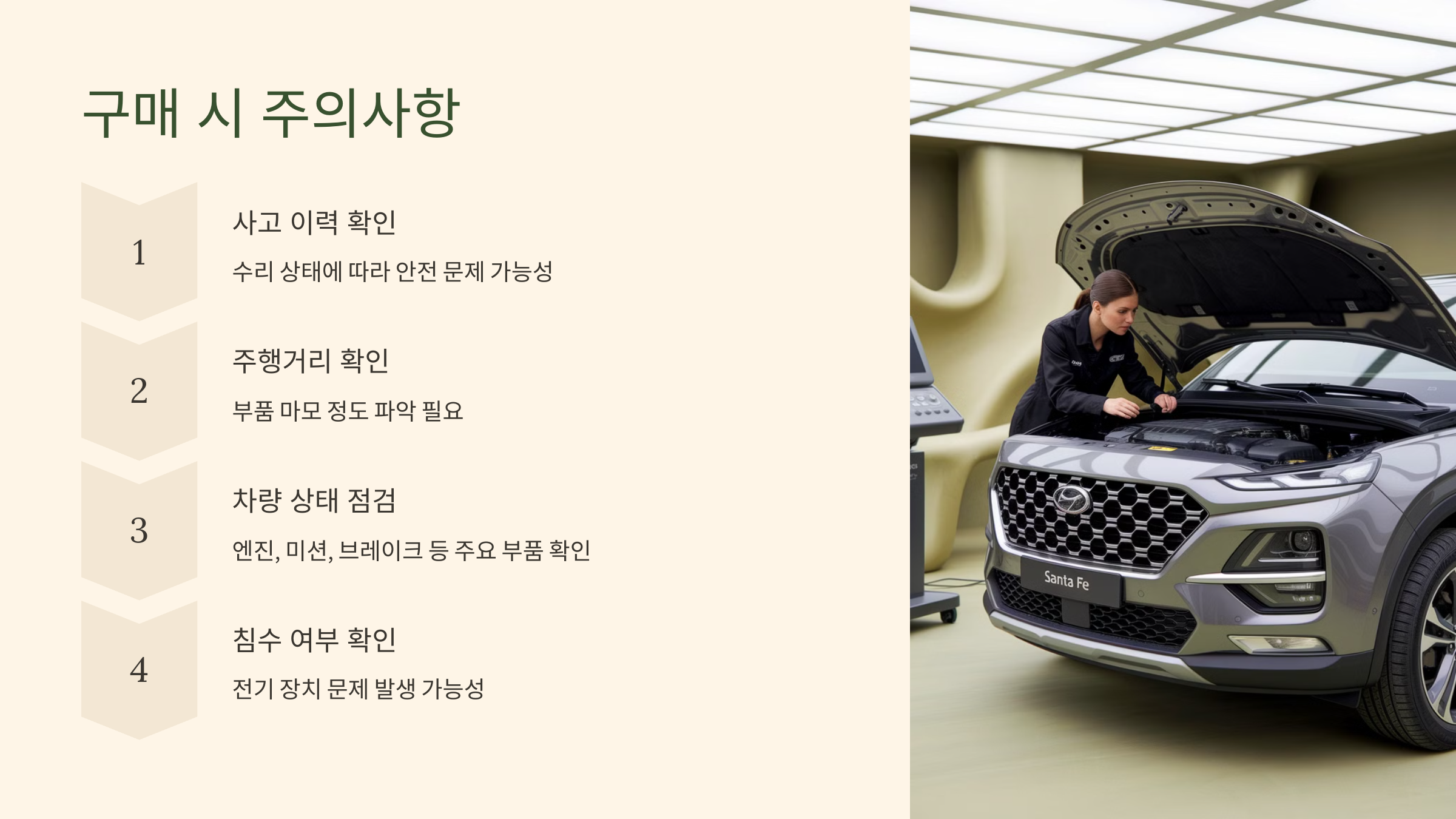 - 차량 상태 점검: 엔진, 미션, 브레이크 등 주요 부품의 상태를 점검하고, 시운전을 통해 이상 유무를 확인해야 합니다.