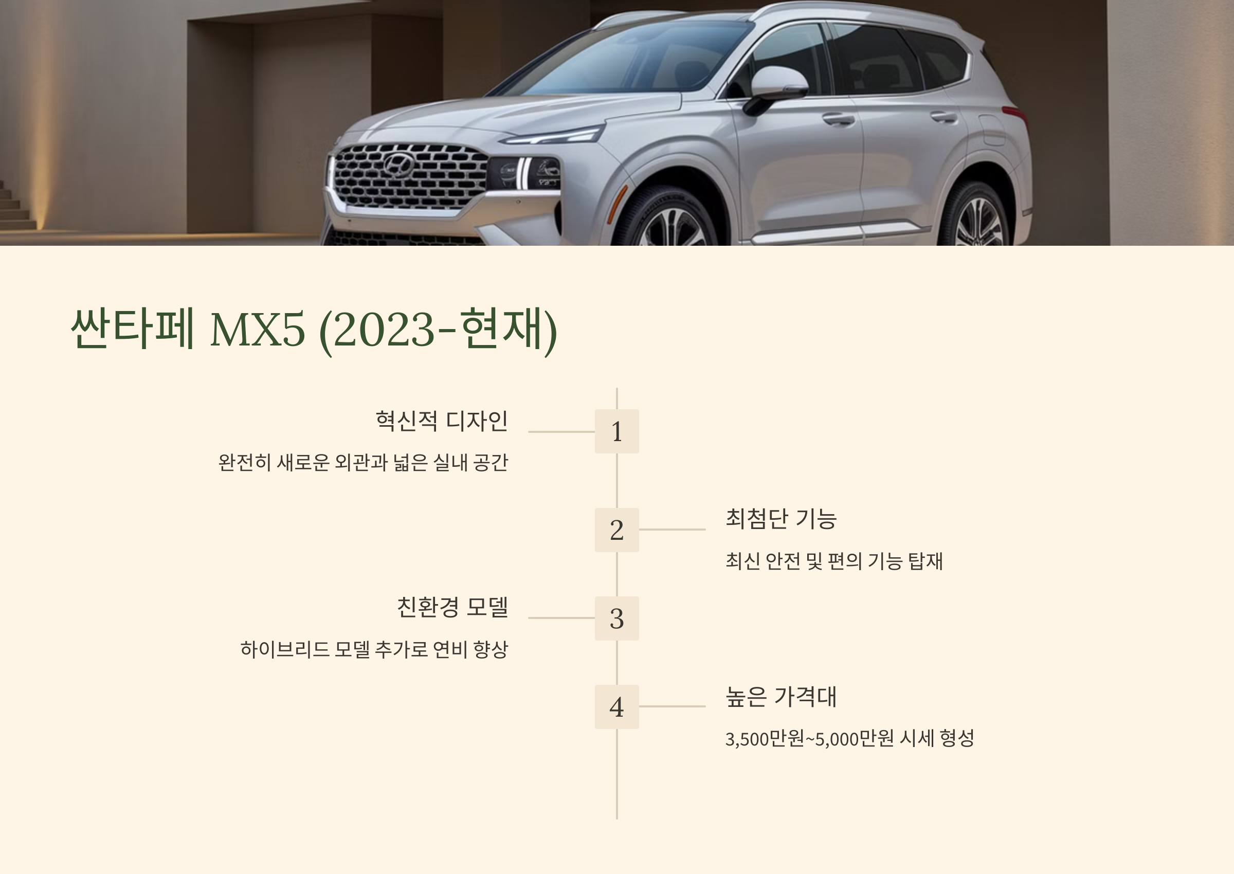싼타페 MX5는 5세대 모델로, 2023년부터 현재까지 생산되고 있습니다. 풀체인지를 통해 완전히 새로운 디자인으로 변신했으며, 넓은 실내 공간과 다양한 편의 기능을 제공합니다. 특히, 하이브리드 모델을 추가하여 친환경성을 강화했습니다.