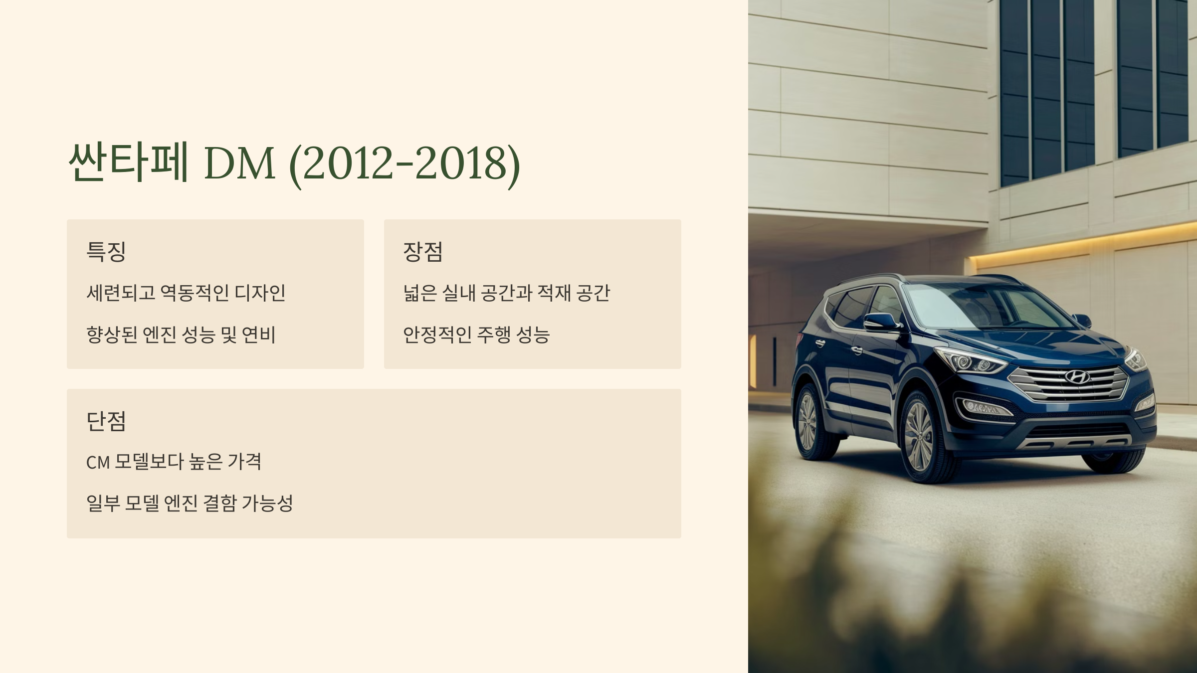 싼타페 DM은 3세대 모델로, 2012년부터 2018년까지 생산되었습니다. 이전 모델에 비해 더욱 세련된 디자인과 향상된 성능으로 많은 사랑을 받았습니다. 특히, 다양한 안전 및 편의 기능을 탑재하여 운전자와 탑승자 모두에게 편안한 주행 경험을 제공합니다.