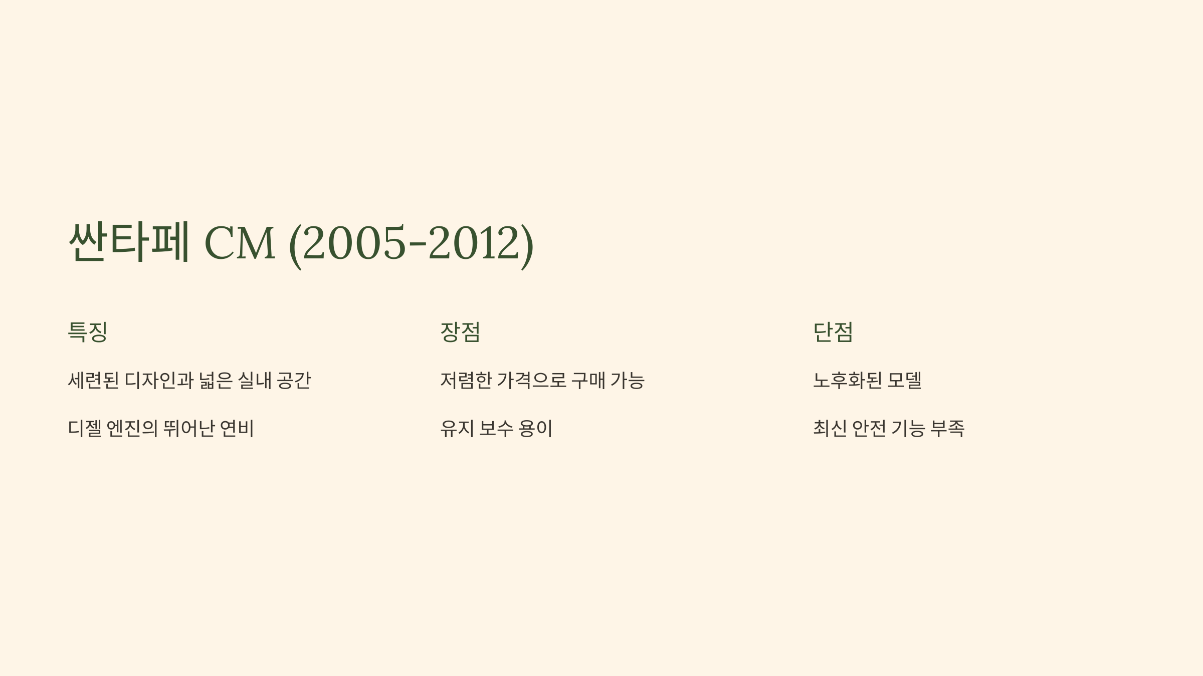 싼타페 CM은 2세대 모델로, 2005년부터 2012년까지 생산되었습니다. 당시 SUV 시장에서 큰 인기를 끌었으며, 넉넉한 공간과 안정적인 주행 성능으로 패밀리카로서의 역할을 톡톡히 했습니다.