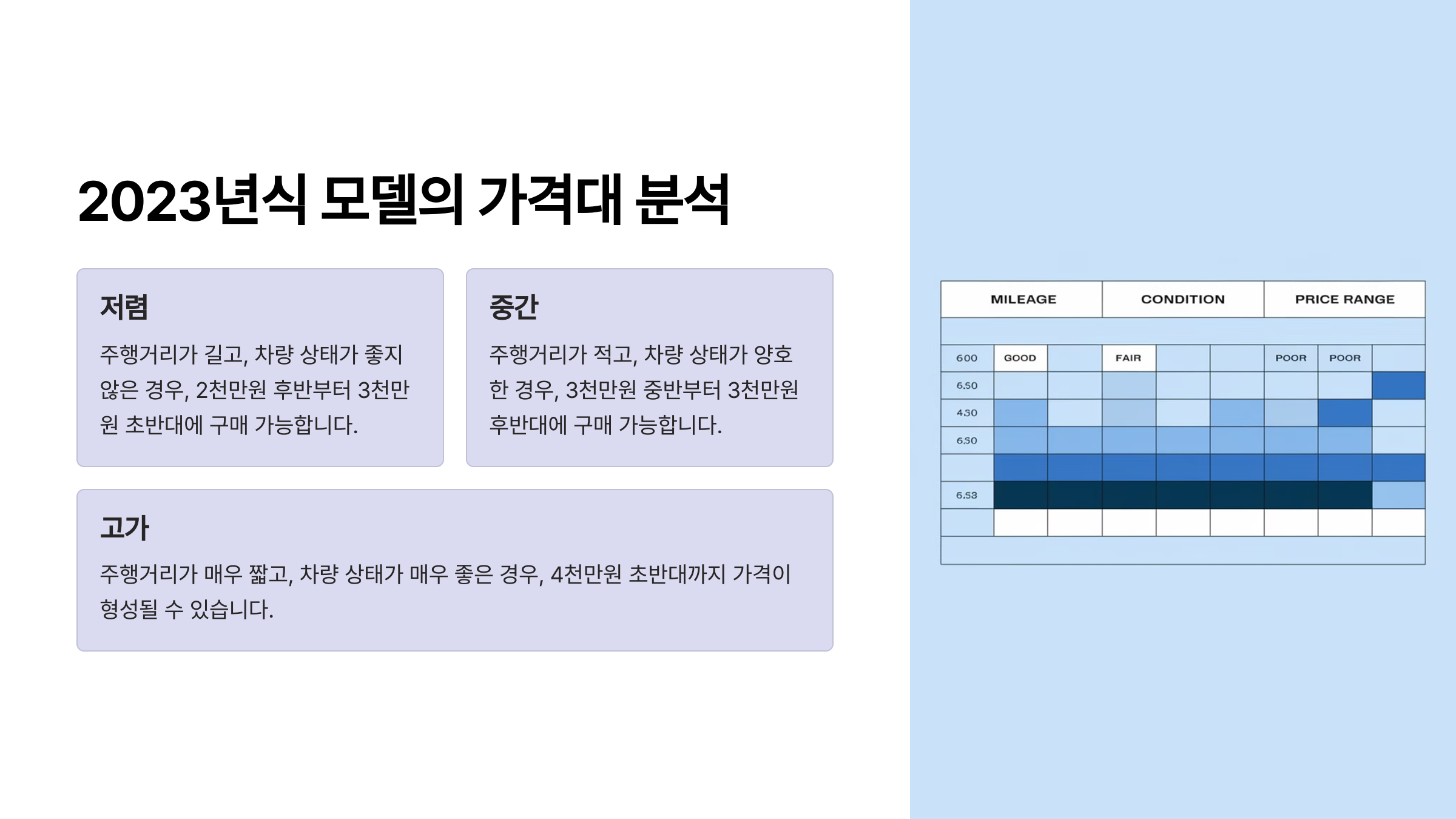 - 옵션: 선호도가 높은 옵션(내비게이션, 선루프, 스마트 크루즈 컨트롤 등)이 추가된 차량은 가격이 높게 형성됩니다.