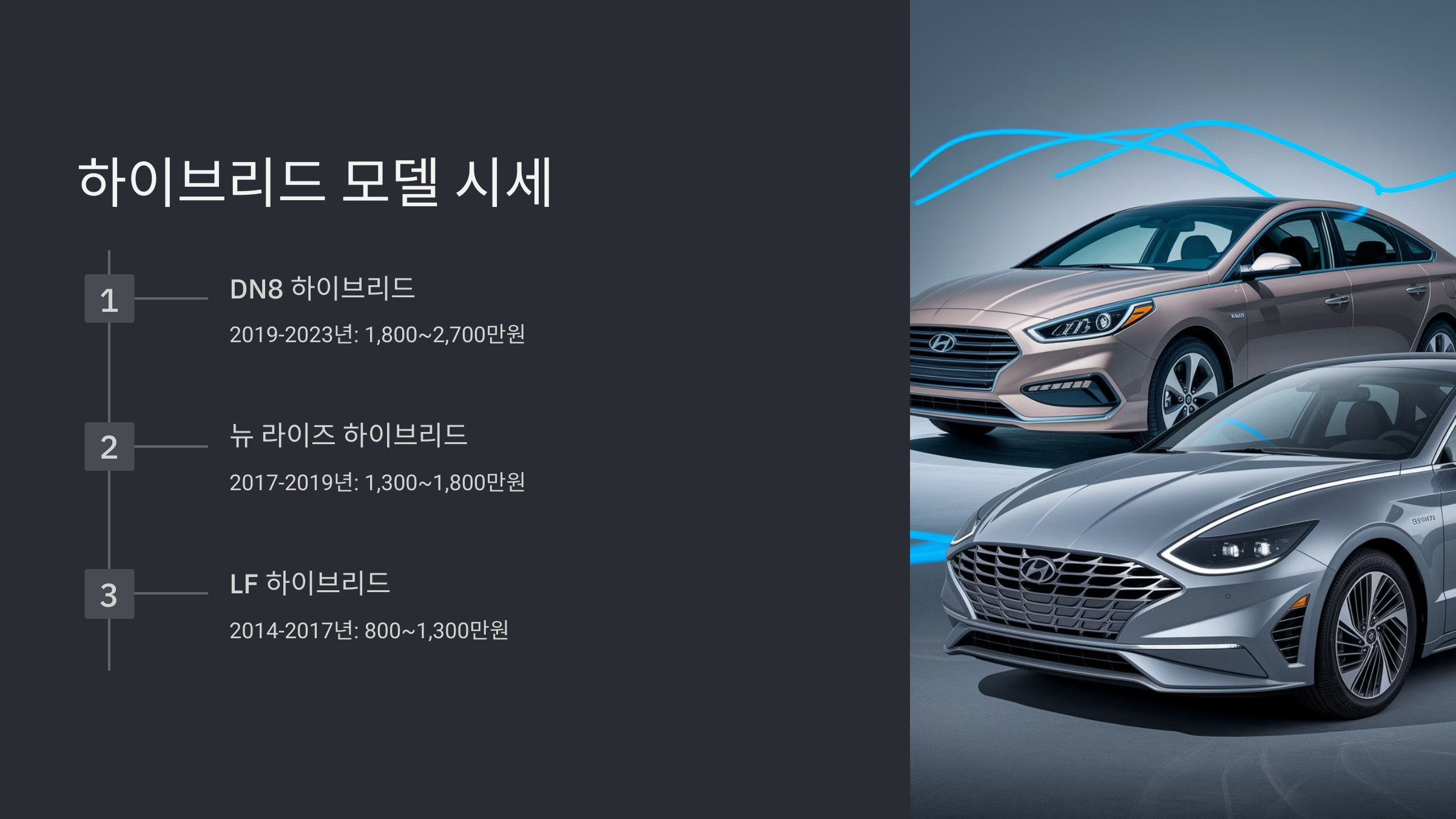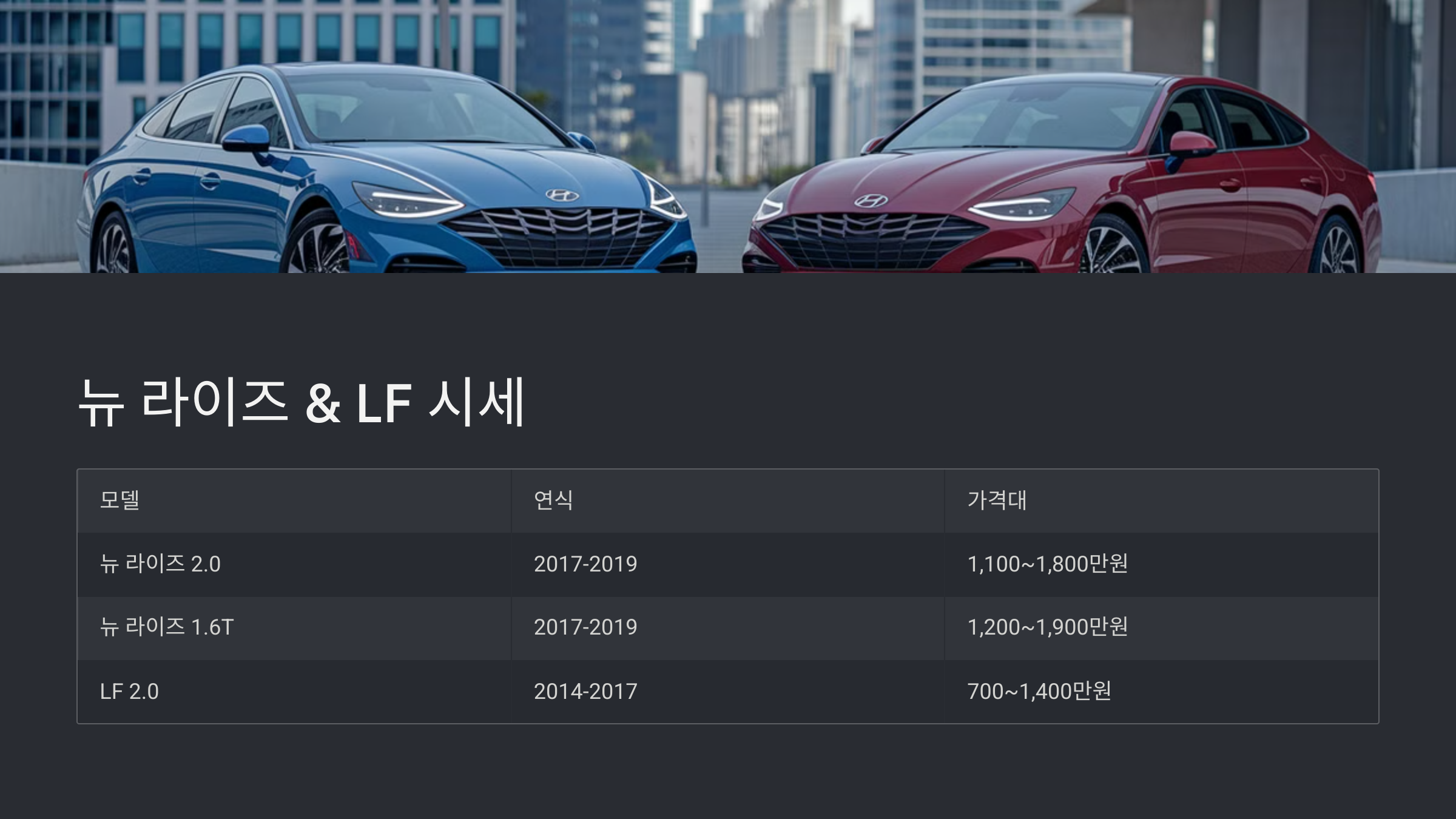 | 쏘나타 LF 하이브리드 | 2014년 ~ 2017년 | 800만원 ~ 1,300만원 |