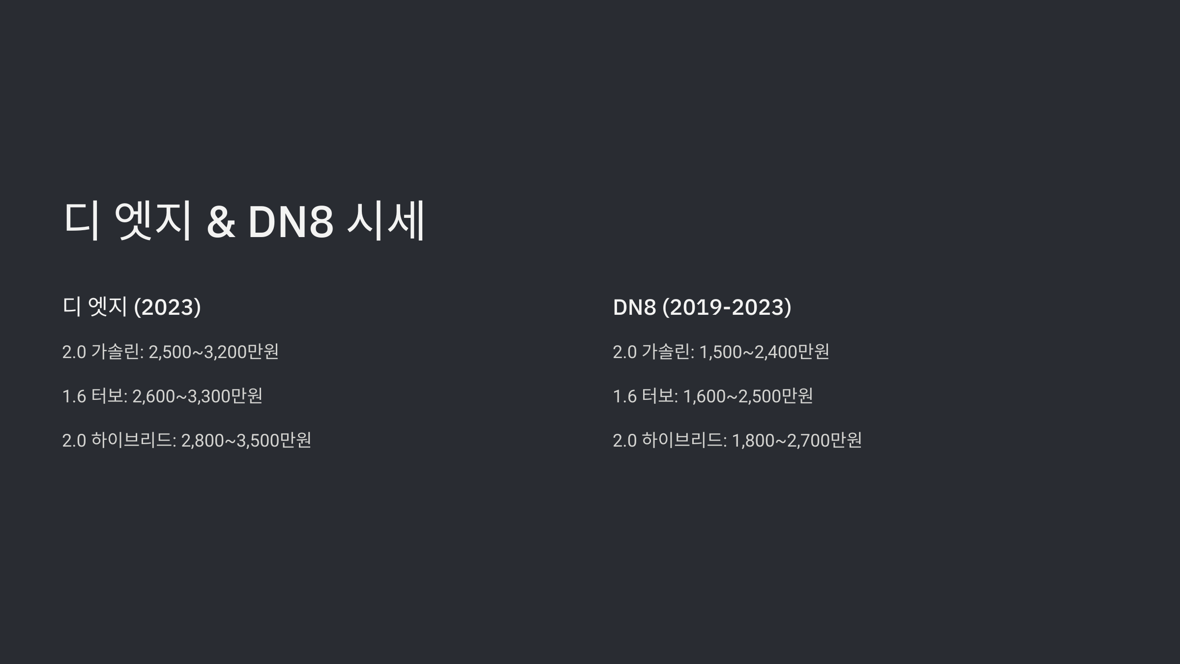 | 2021년 | 2.0 하이브리드 | 2,000만원 ~ 2,500만원 |