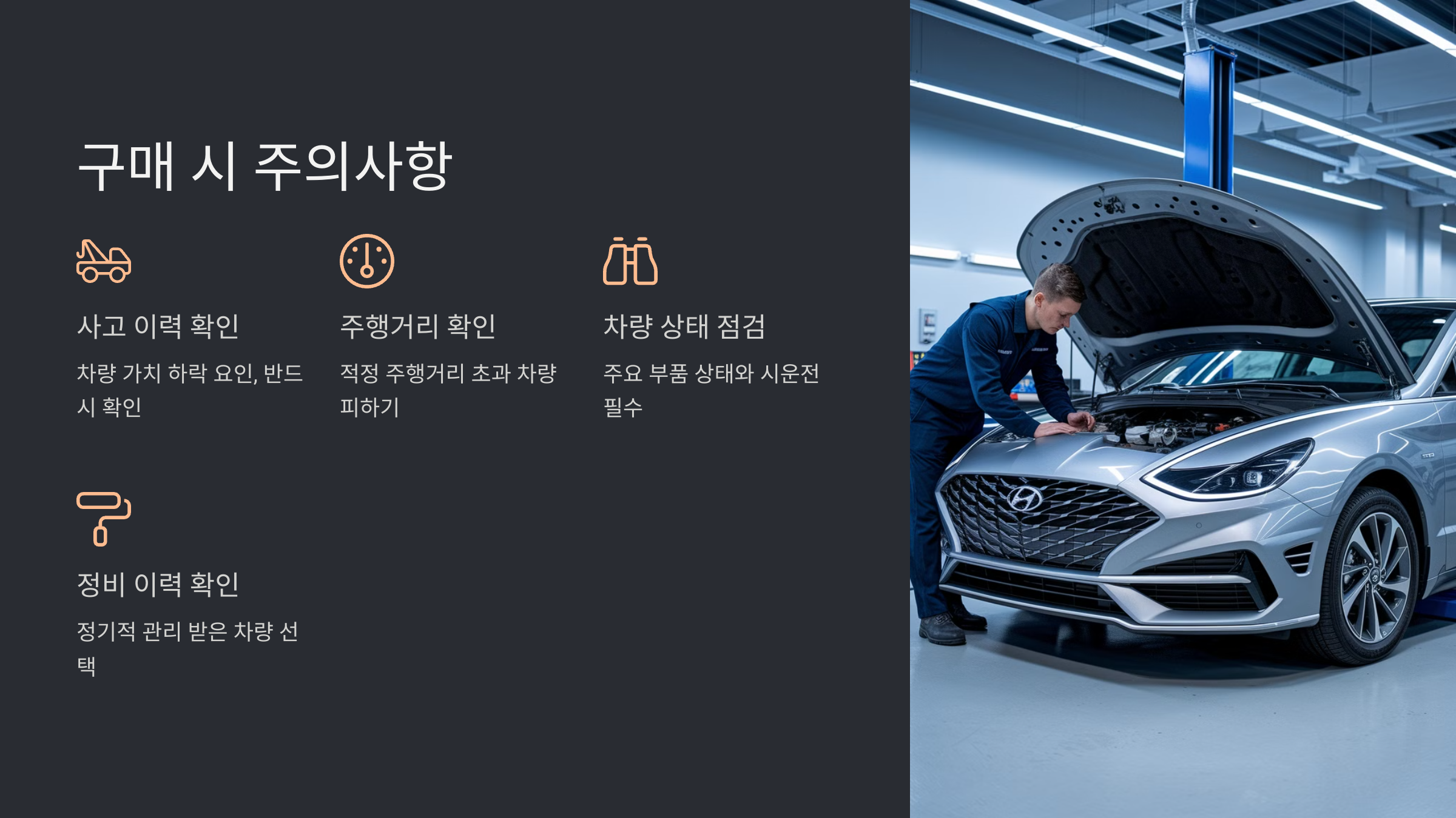 - 차량 상태 점검: 엔진, 미션, 브레이크 등 주요 부품의 상태를 꼼꼼하게 점검하고, 시운전을 통해 차량의 성능을 확인해야 합니다.
