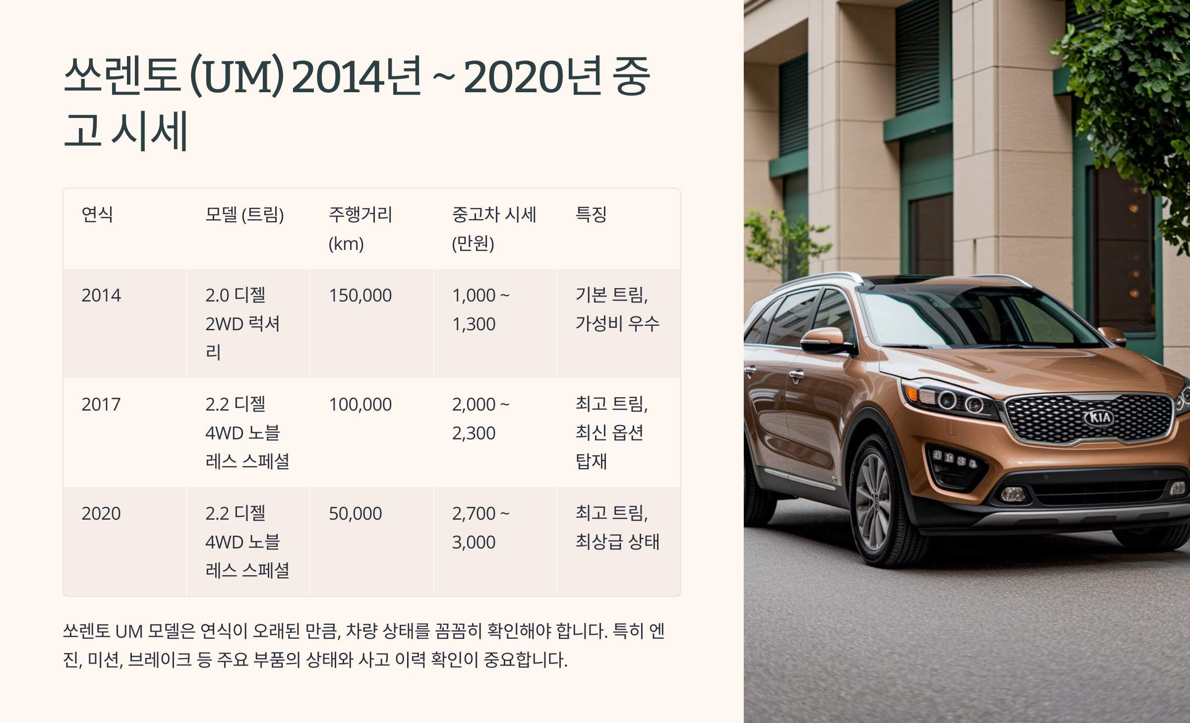 주의사항: 쏘렌토 UM 모델은 연식이 오래된 만큼, 차량 상태를 꼼꼼하게 확인해야 합니다. 특히 엔진, 미션, 브레이크 등 주요 부품의 상태를 점검하고, 사고 이력을 확인하는 것이 중요합니다.