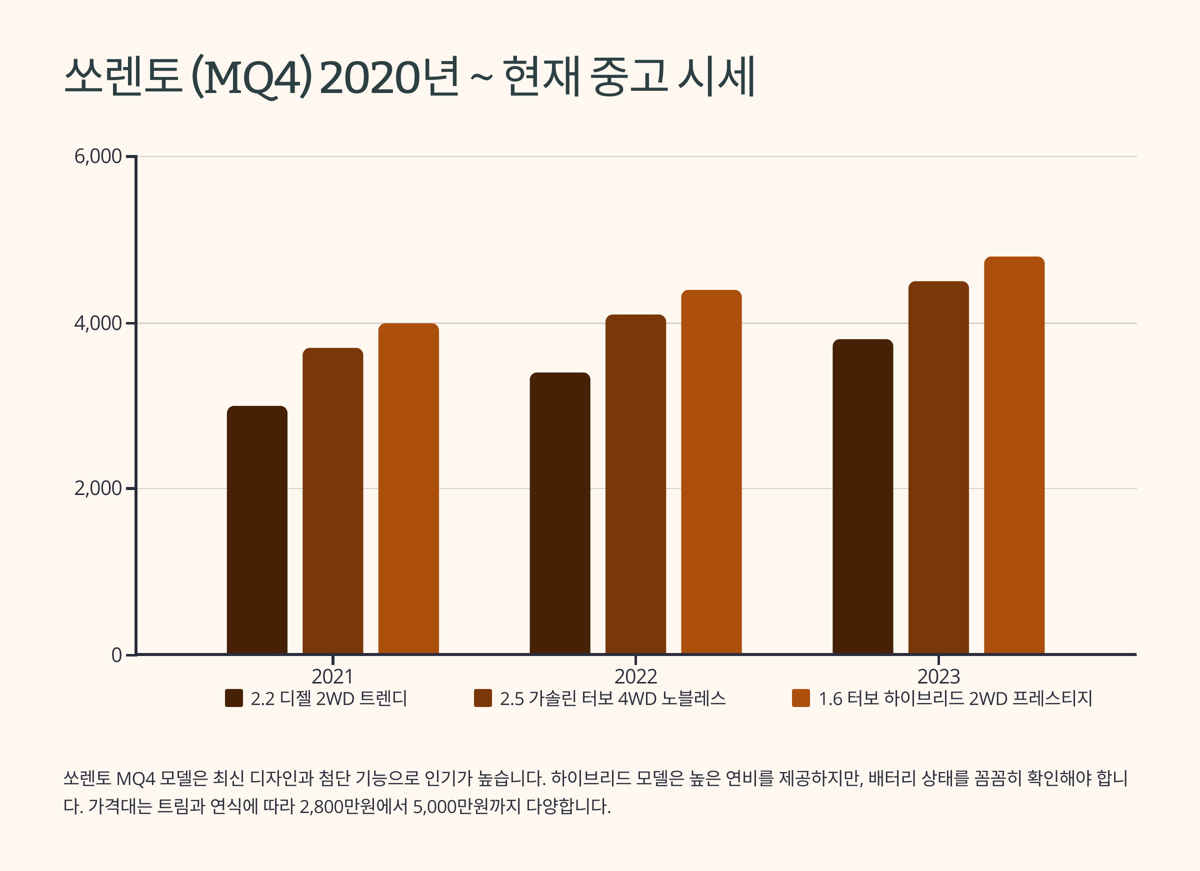 주의사항: 쏘렌토 MQ4 모델은 최신 모델인 만큼, 가격이 높은 편입니다. 하지만 최신 기술과 편의 기능을 누릴 수 있다는 장점이 있습니다. 하이브리드 모델은 높은 연비를 제공하지만, 배터리 상태를 꼼꼼하게 확인해야 합니다.
