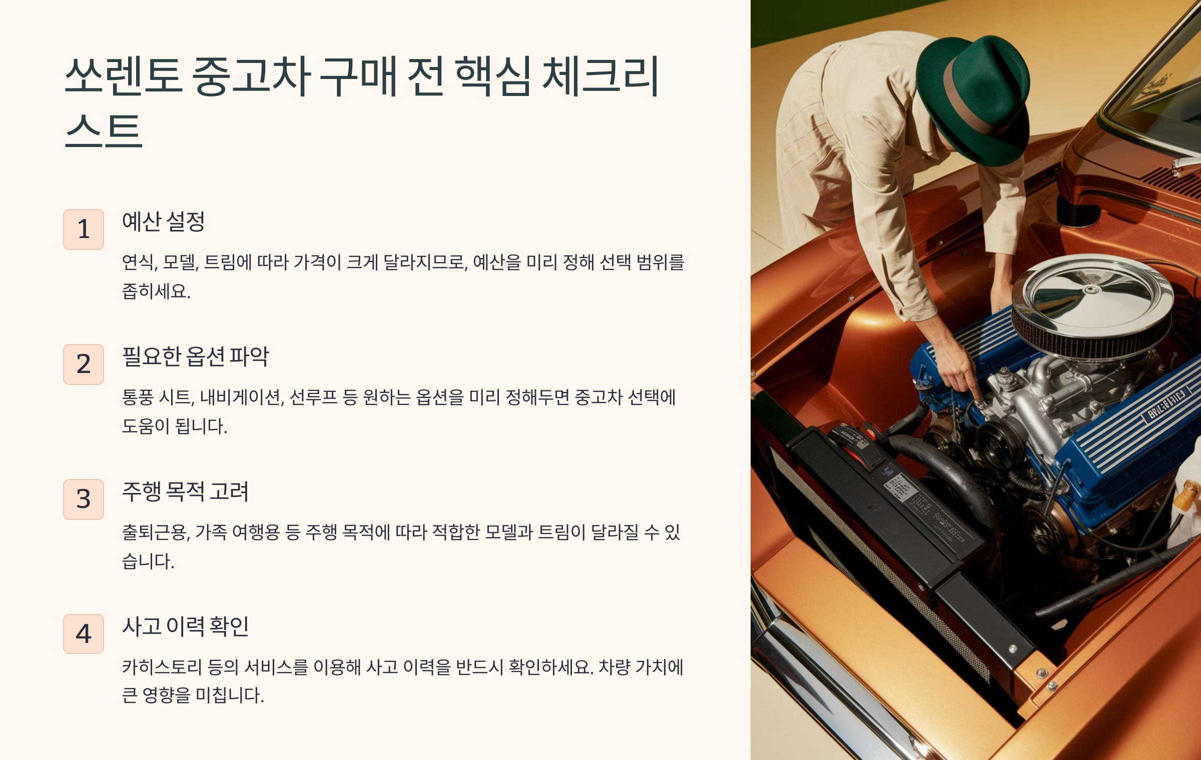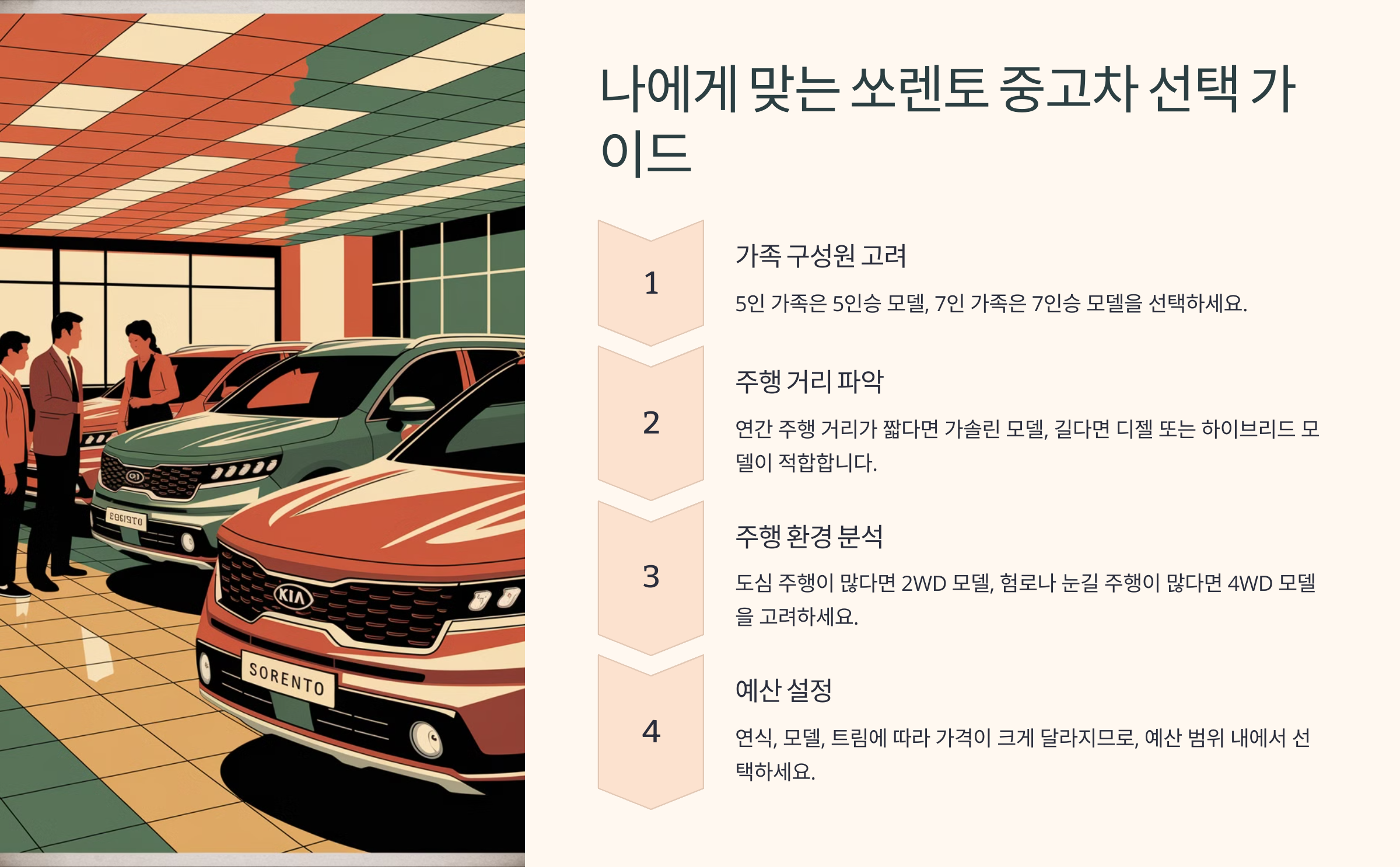 - 예산: 쏘렌토 중고 가격은 연식, 모델, 트림에 따라 크게 달라지므로, 예산을 정해두고 그 범위 내에서 선택하는 것이 좋습니다.